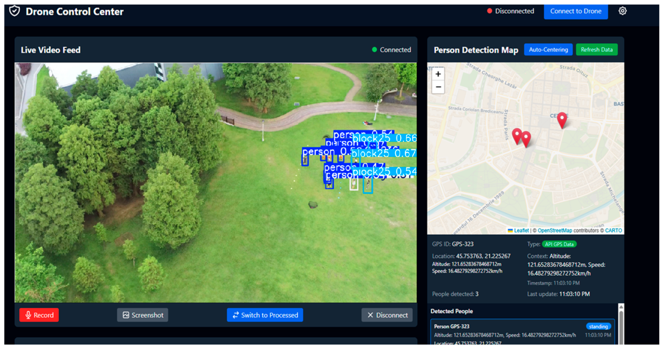 Human–Machine Interface (HMI): The front end provides the human operator with complete situational awareness. One key feature is the interactive map that displays the drone’s position, the precise location of any detected individuals, and other relevant geospatial data in real time. Simultaneously, the operator can view the live video stream annotated in real time by the detection module, which highlights victims and classifies their status (e.g., walking, standing, or lying down).