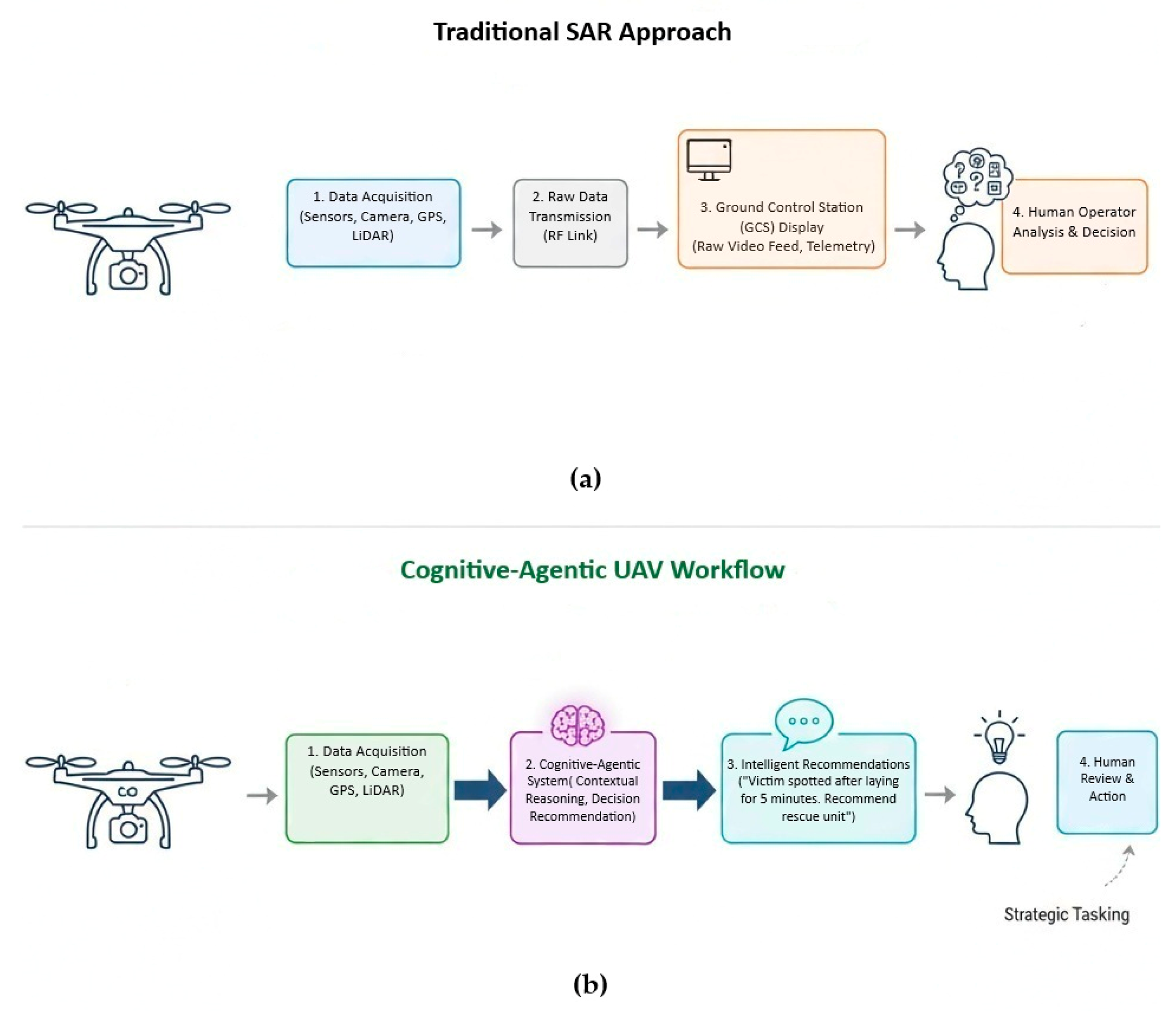 To overcome these limitations and take advantage of the convergence of these fields, we propose a cognitive–agentic architecture that will transform drones from mere observation tools into proactive, intelligent partners in search and rescue operations. Our work’s key contribution lies in its modular agentic approach, where specialized software agents manage perception, memory, reasoning and action separately.