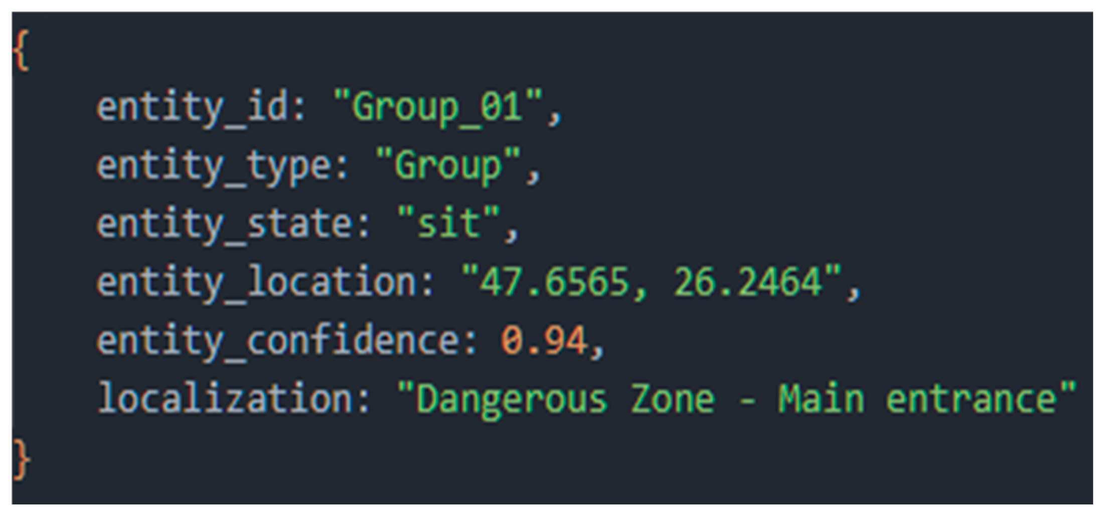 During the initialization phase, the detection of a person in a “sitting” state was simulated, which is a significant class because it refers to individuals who may be lying on the ground or unable to move. The RaAg module’s contextualization immediately raised the alert level, transforming a simple detection into a potential medical emergency scenario. The memory agent (MAg) reported that the same entity had previously been detected at approximately the same coordinates, and that the interval between detections had exceeded two minutes. This indicated possible prolonged immobility. According to MAg data, the area in question was classified as dangerous because it was located outside the marked routes. The data provided by RaAg corresponding to this situation is presented in