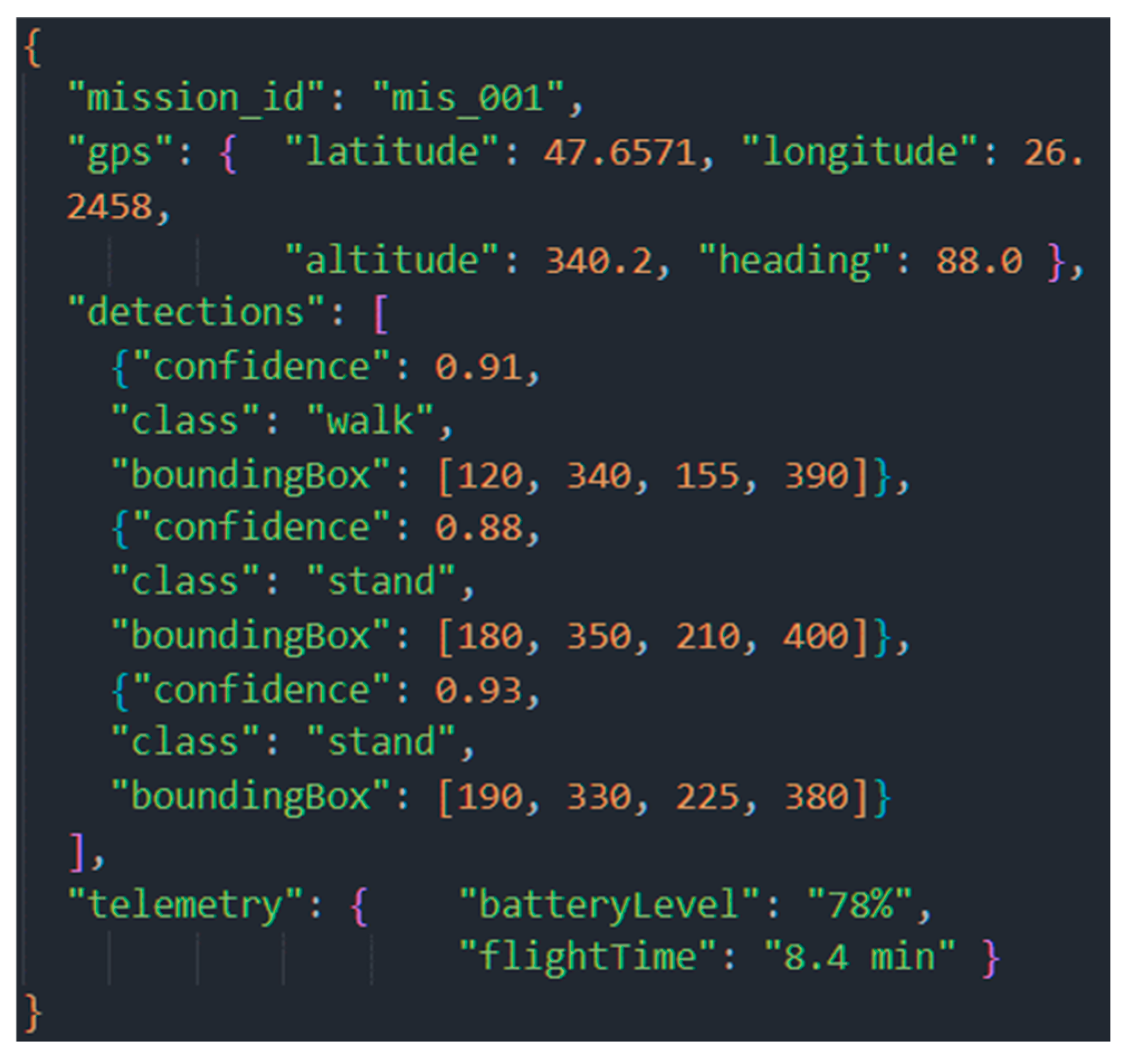 The data stream received by the Perception Agent (PAg) included GPS location information, visual detections from the YOLO model, and UAV telemetry data. The structure of the raw data is shown in
