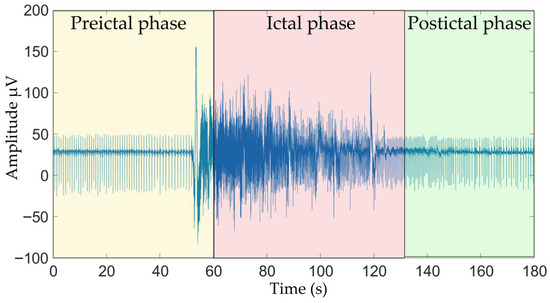 - Ictal phase: This phase corresponds to the seizure event, from the onset to its end. During this phase, hyperexcitation of neuronal activity occurs [5,6].