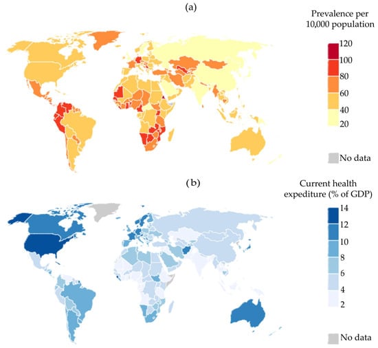 (a) Worldwide epileptic prevalence in 2016 and (b) health expenditure (% of GDP) in 2016.