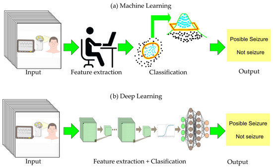 Recently, algorithms based on both ML and DL have been developing AI-based strategies for seizure prediction. To illustrate the main differences between these two frameworks, Figure 5 provides a comparison.