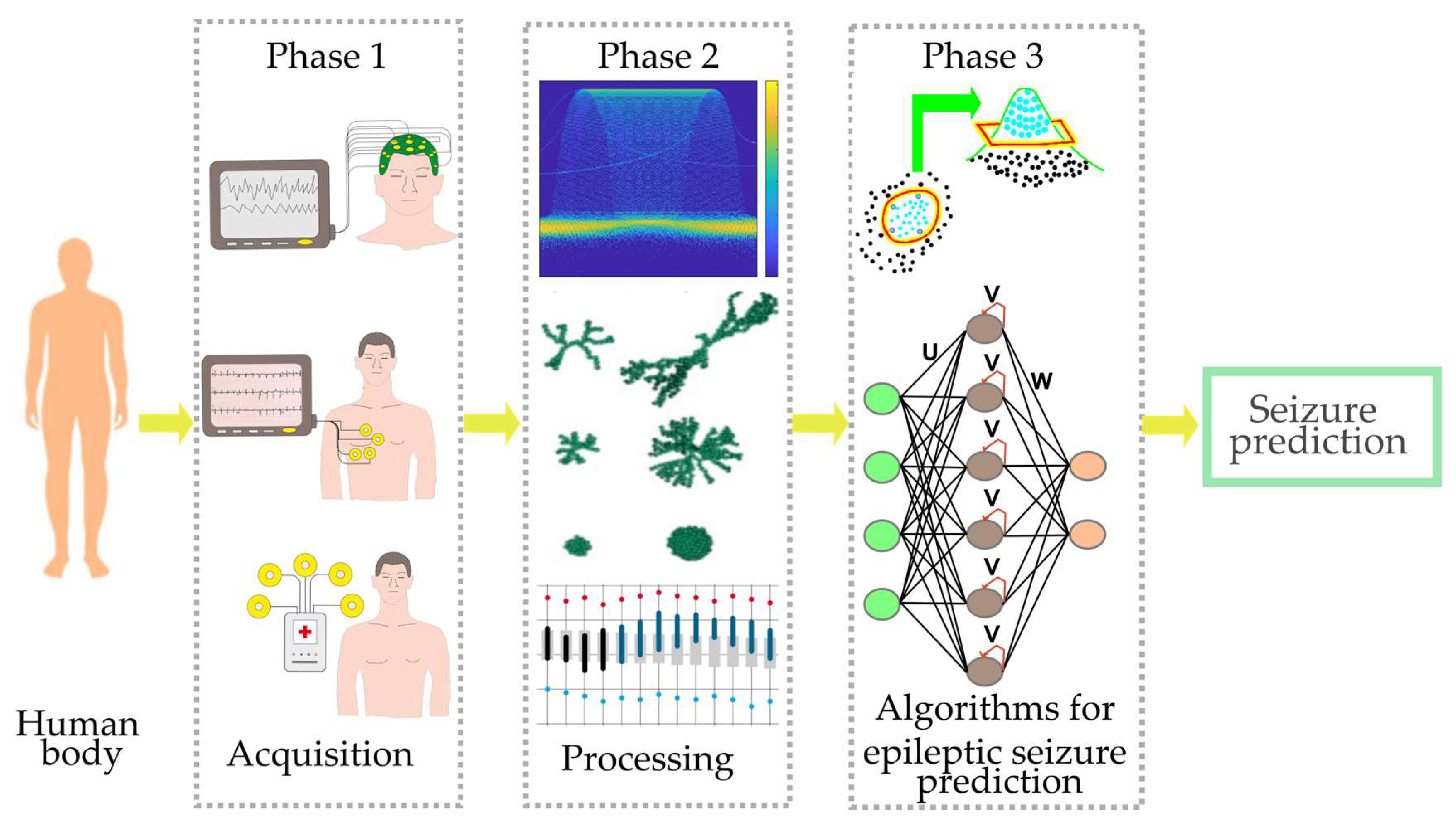 - Phase 1, signal acquisition. This initial phase is detailed by first outlining the bioelectrical signals commonly used for seizure prediction. This is followed by a discussion of some available datasets. Finally, a brief discussion of devices developed for seizure prediction is presented.