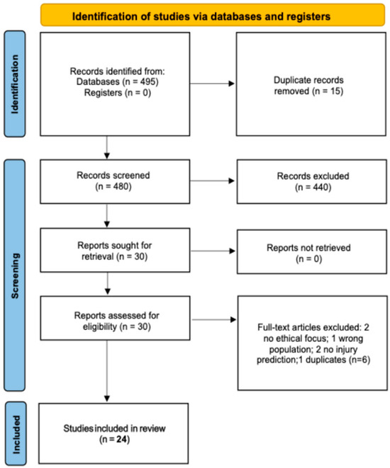 No restrictions were placed on publication year, sport type, or level of competition. Approximately 500 records were initially retrieved. Trained reviewers screened titles and abstracts against the inclusion criteria (outlined above), after which 24 studies were retained for full-text analysis. Additional full texts were obtained through open-access sources or institutional subscriptions when available.