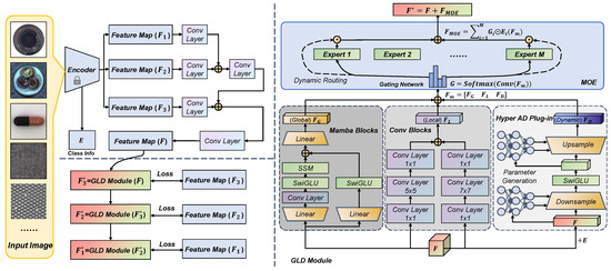 To address this limitation, this paper proposes a dynamic visual adaptation framework for multi-class anomaly detection. First, as shown in Figure 1, we select the Mamba network as the base architecture to ensure powerful feature extraction capabilities. Next, we propose a network plug-in, the Hyper AD Plug-in, which dynamically adjusts the model parameters based on the characteristics of input data. Through the collaboration of the Mamba blocks, CNN blocks, and the proposed Hyper AD Plug-in, we extract the global, local, and dynamic features for multi-class data. Furthermore, we introduce the Mixture-of-Experts (MoE) module, which consists of multiple experts and a gating network responsible for the dynamic routing mechanism. Through this mechanism, the MoE module dynamically selects the most relevant expert to process the input samples, thereby enhancing the accuracy of multi-class anomaly detection. The source code is available at https://github.com/bebop96/DVAD.git (accessed on 1 November 2025).
