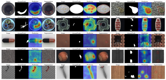 Defects visualization of the MVTec AD dataset. From left to right, the images are the original image, the ground truth for defect annotations, the predicted anomaly score map by the model, and the final anomaly region localization result.