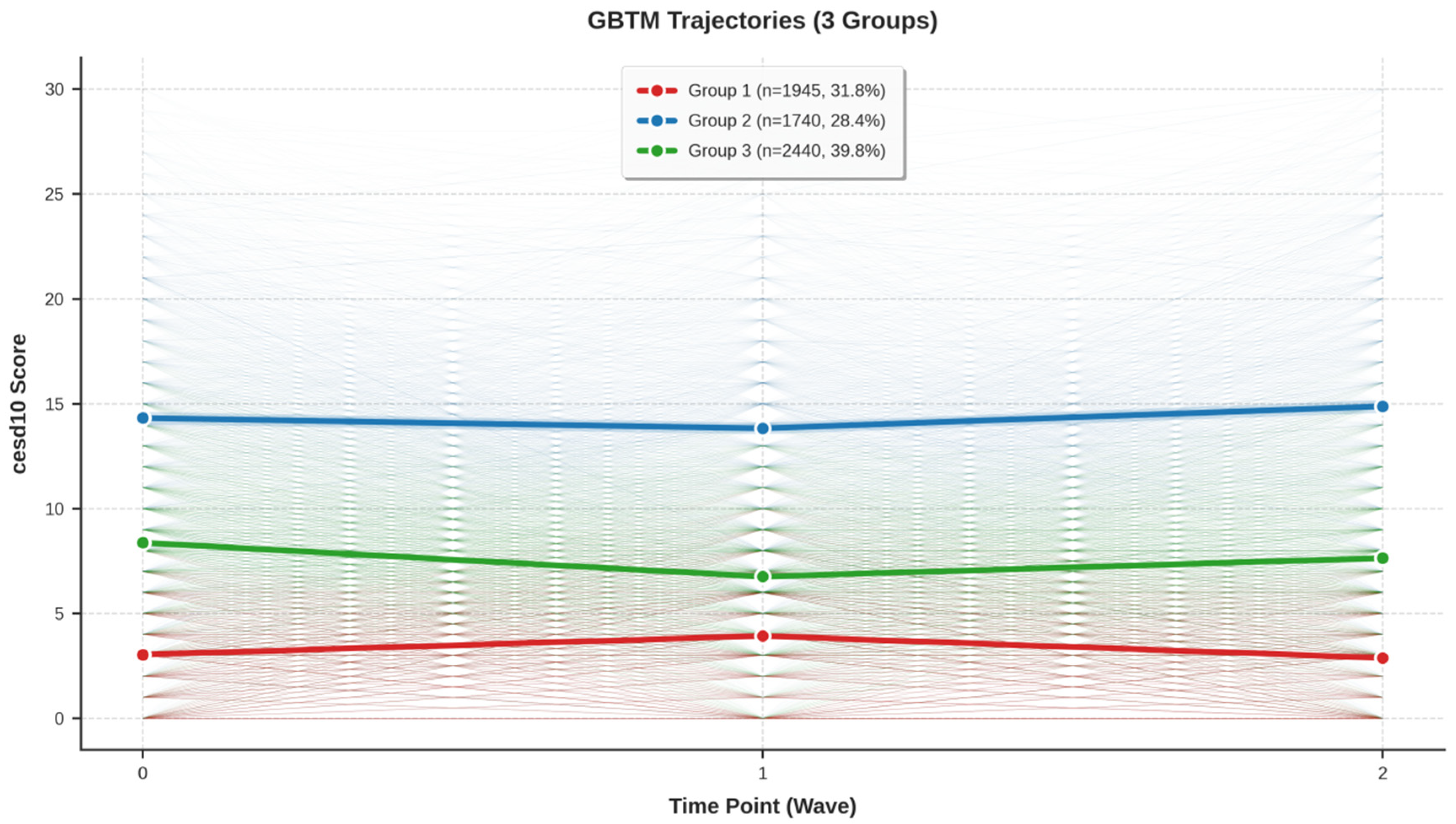 We employed Group-Based Trajectory Modeling (GBTM) on CESD-10 scores from Waves 1 to 4 to identify distinct subgroups of older adults with similar long-term depressive symptom patterns. We estimated models with one to six trajectory classes. The optimal number of latent trajectories was determined by comparing these models using several key metrics: (1) Information Criteria: The Bayesian Information Criterion (BIC) and the Akaike Information Criterion (AIC) were used as the primary statistical criteria. Lower values indicate a better model fit, with BIC placing a stronger penalty on model complexity. (2) Classification Quality: The Average Posterior Probability (AvePP) for each class was examined to assess the accuracy of class assignment. AvePP values above 0.70 for all classes are considered indicative of good classification certainty. (3) Class Proportions and Interpretability: The substantive meaning and clinical relevance of the trajectories, along with the proportion of individuals in each class, were critically evaluated. We required that the final solution yield distinct, interpretable patterns with all class proportions being substantively meaningful. We primarily employed the Group-Based Trajectory Modeling (GBTM) approach, specifically the Latent Class Growth Model (LCGM) which assumes homogeneity within classes, for its parsimony and clinical interpretability. To justify this choice, we conducted a sensitivity analysis comparing LCGM with the more flexible Growth Mixture Model (GMM), which allows for within-class variation. As presented in