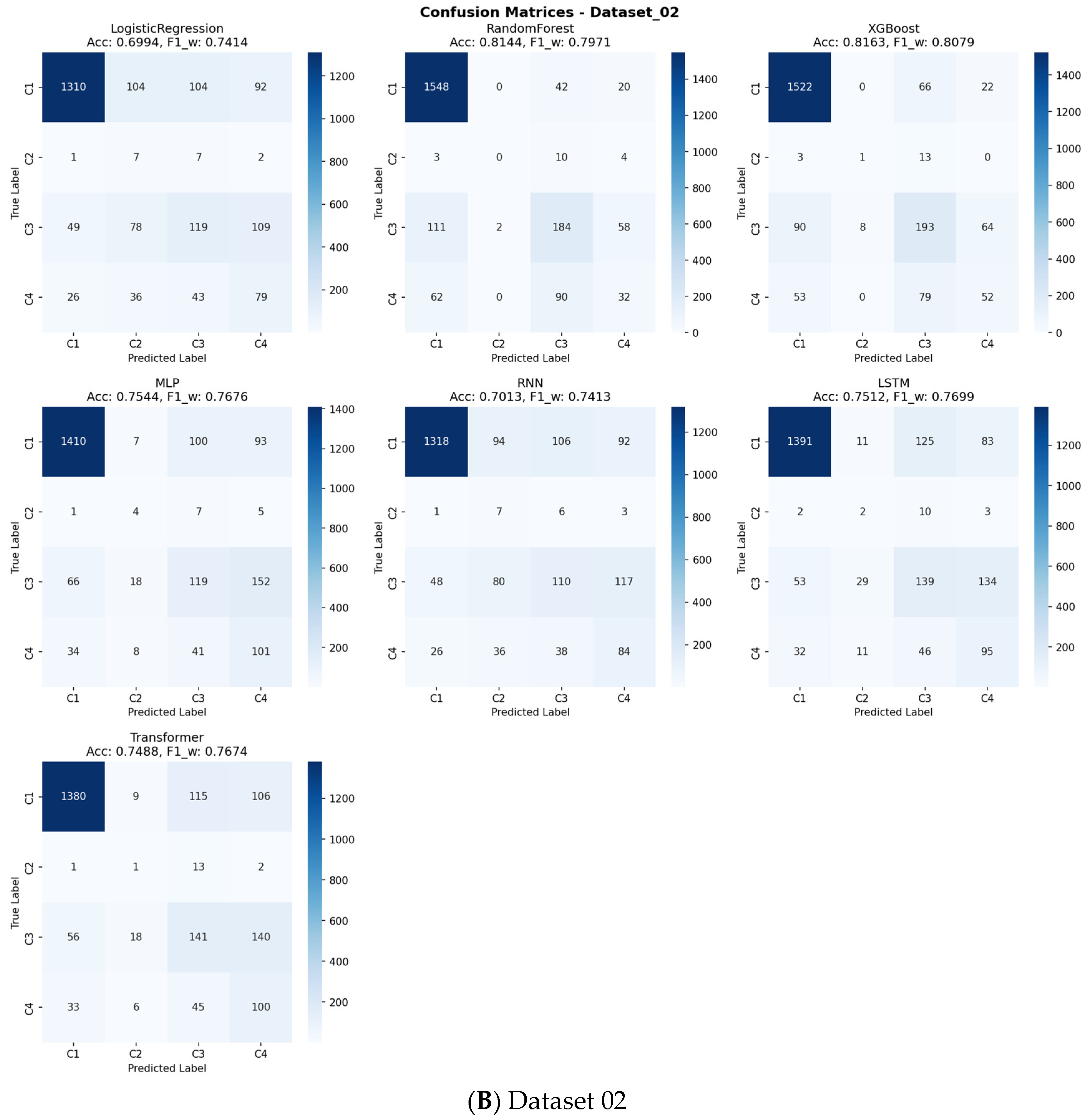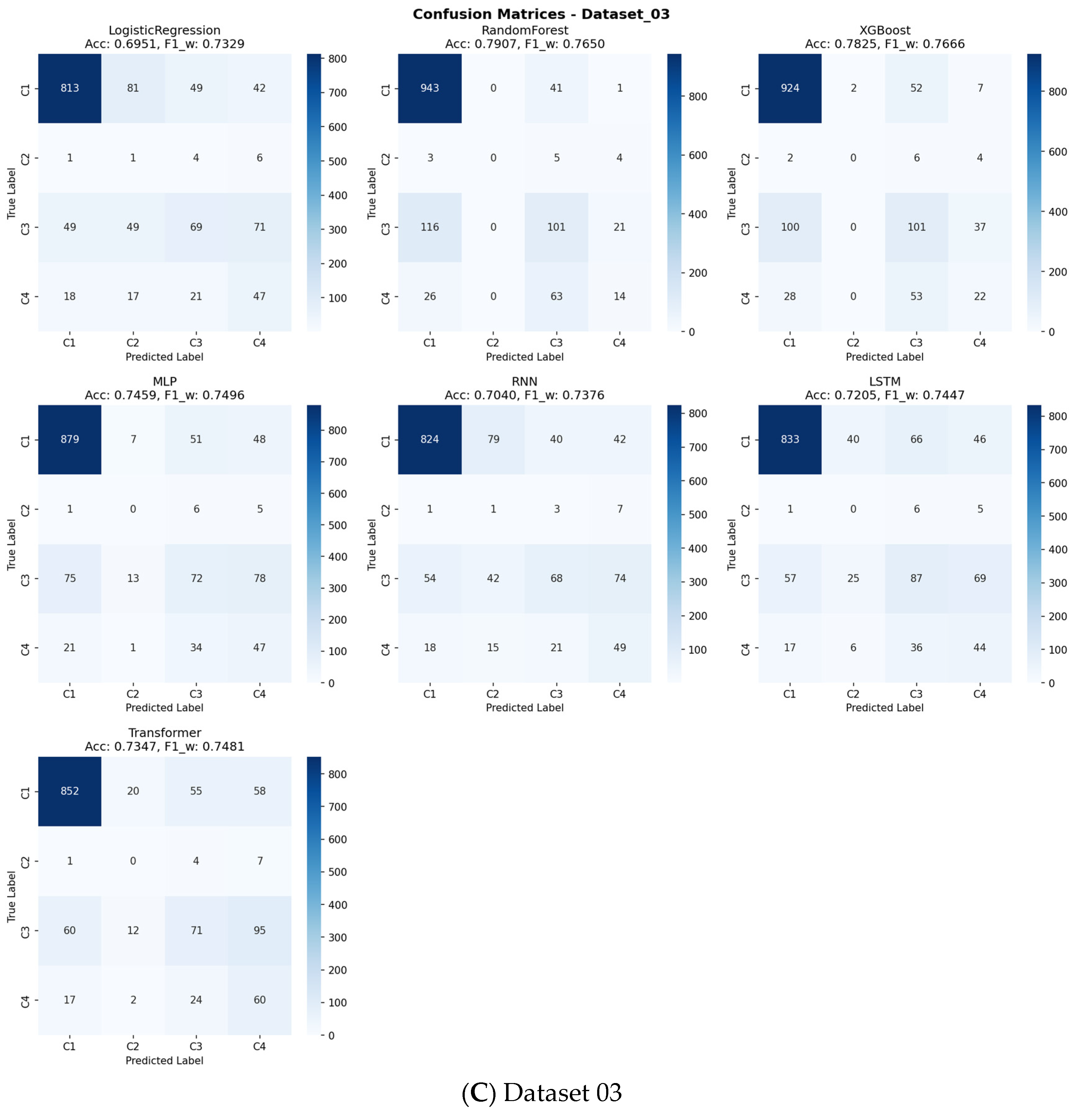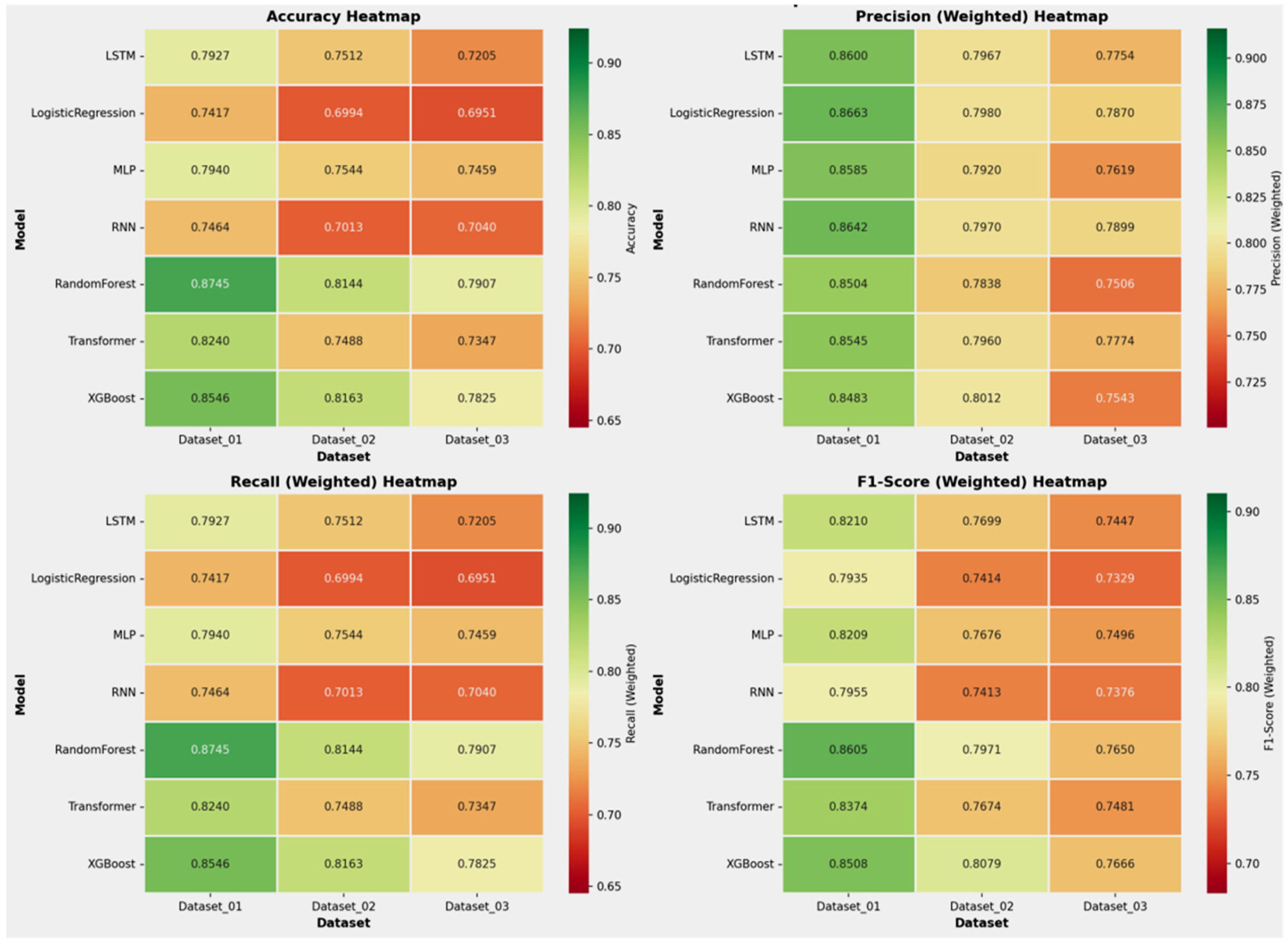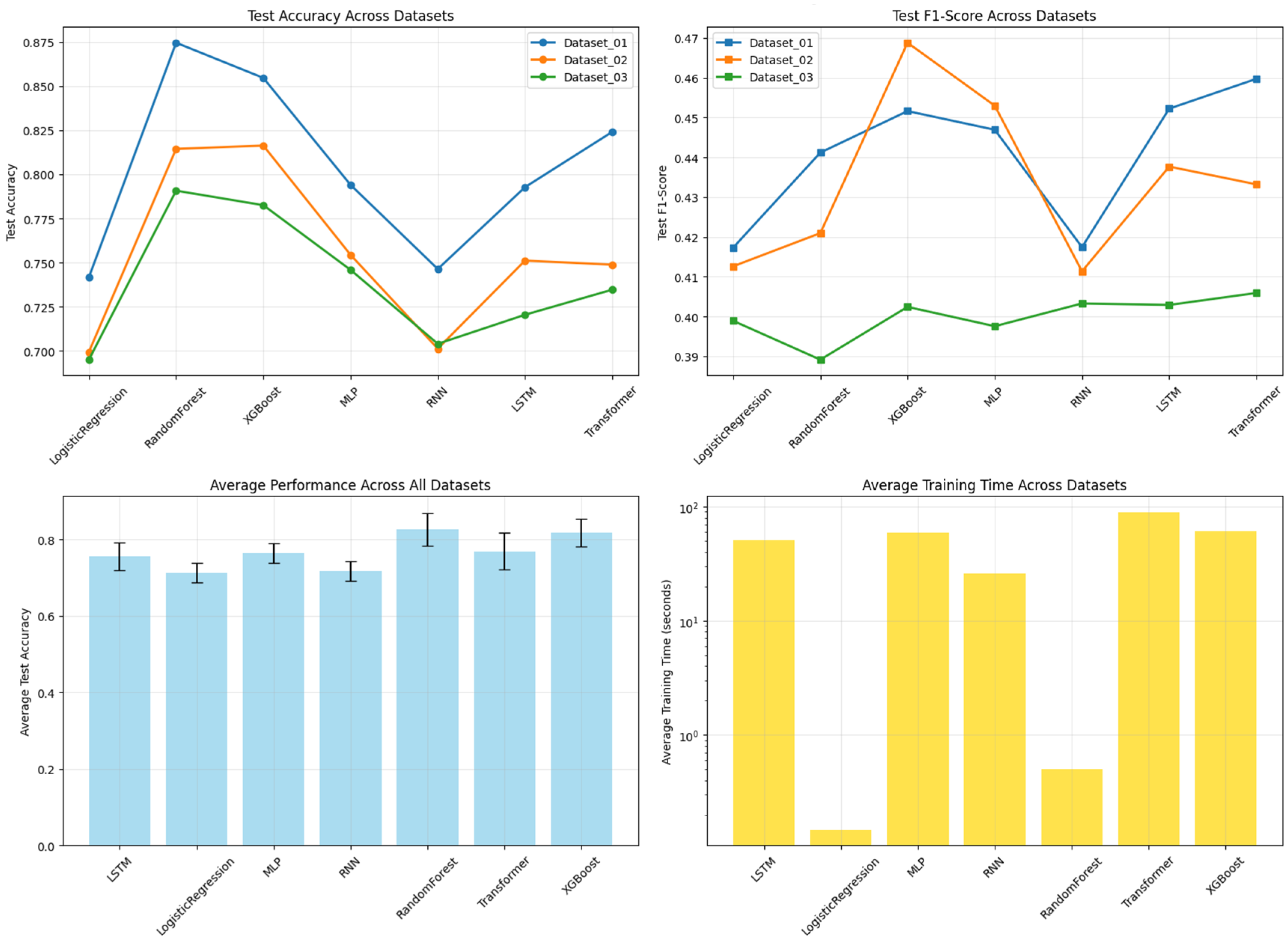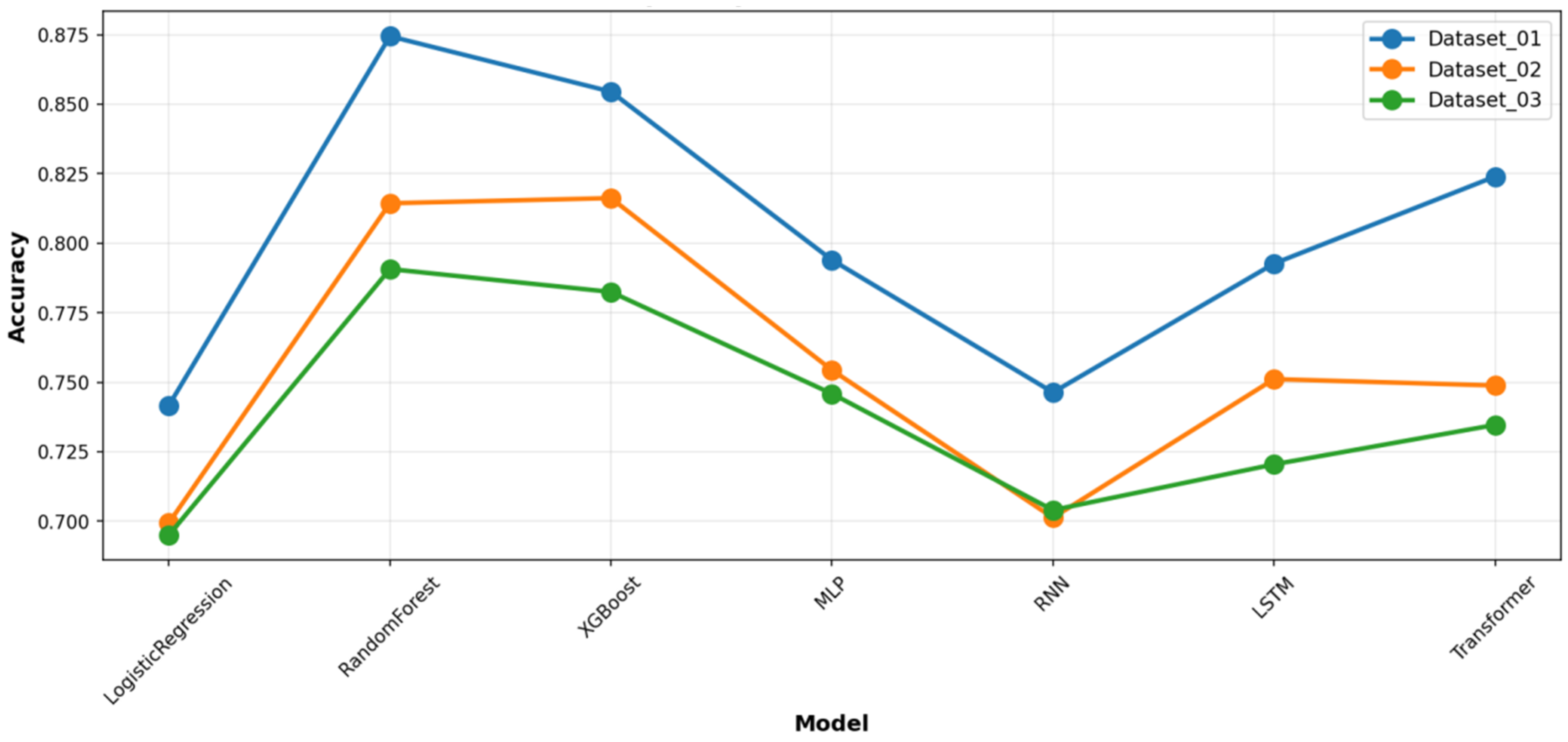 Figure 5). Notably, the Transformer model achieved competitive accuracy on Dataset_01 (0.824), suggesting an aptitude for capturing specific long-term temporal dependencies in depressive symptoms. However, its performance exhibited greater variability across datasets compared to the more stable tree-based ensembles. The deep learning models showed clear signs of overfitting and demonstrated poor generalization capability. Furthermore, all deep learning models required substantially greater computational resources for training. This establishes the practical superiority of tree-based ensembles for this specific prediction task.