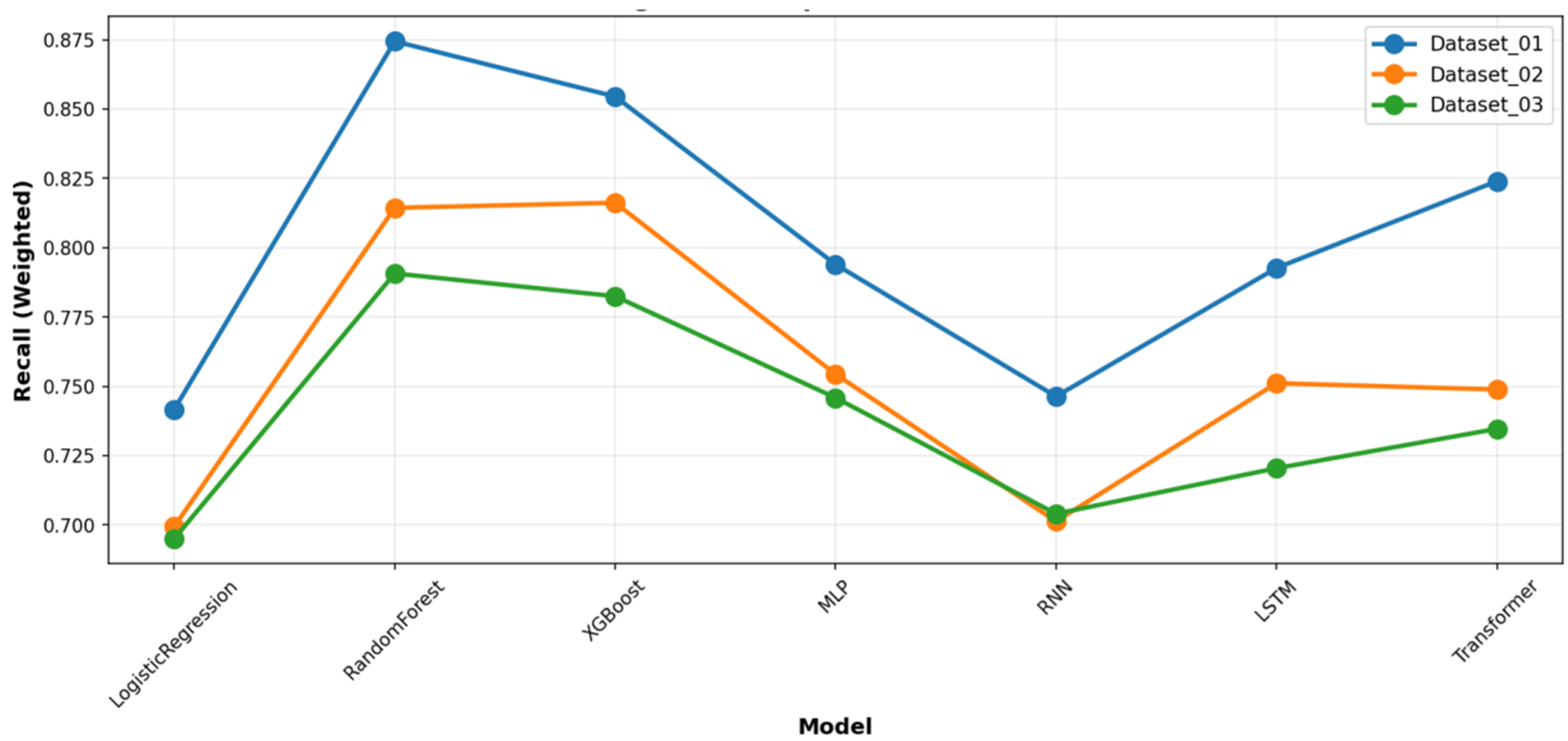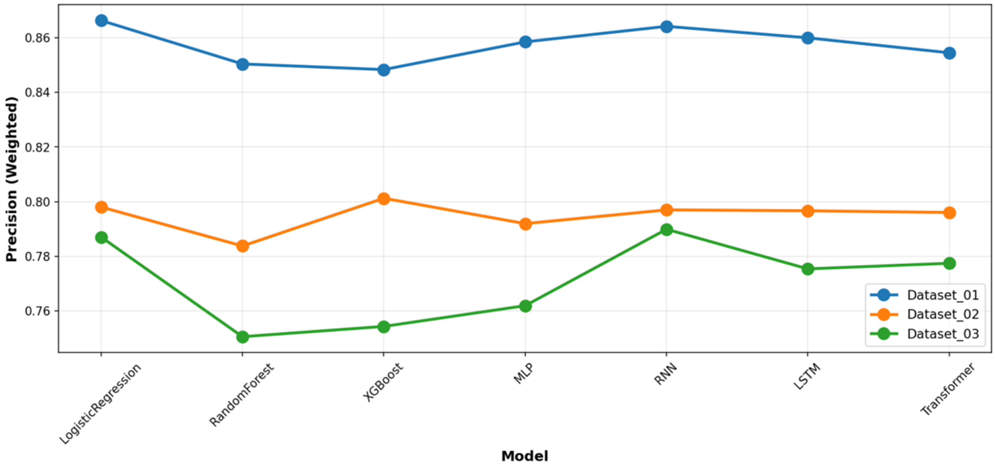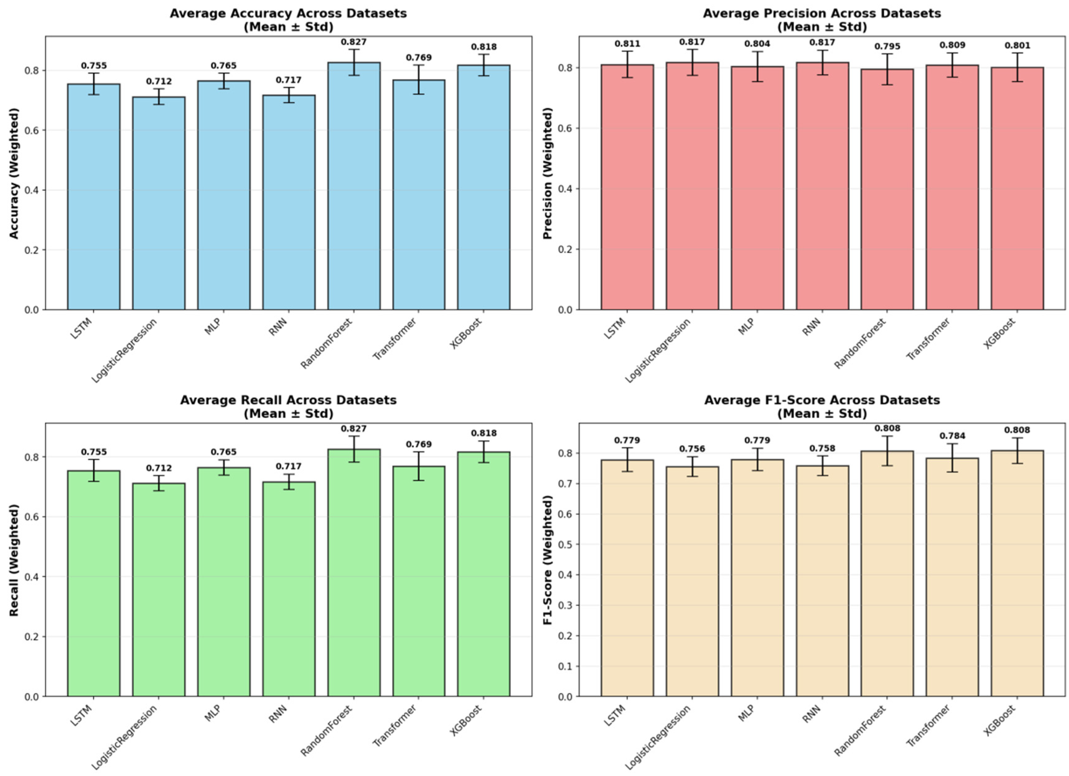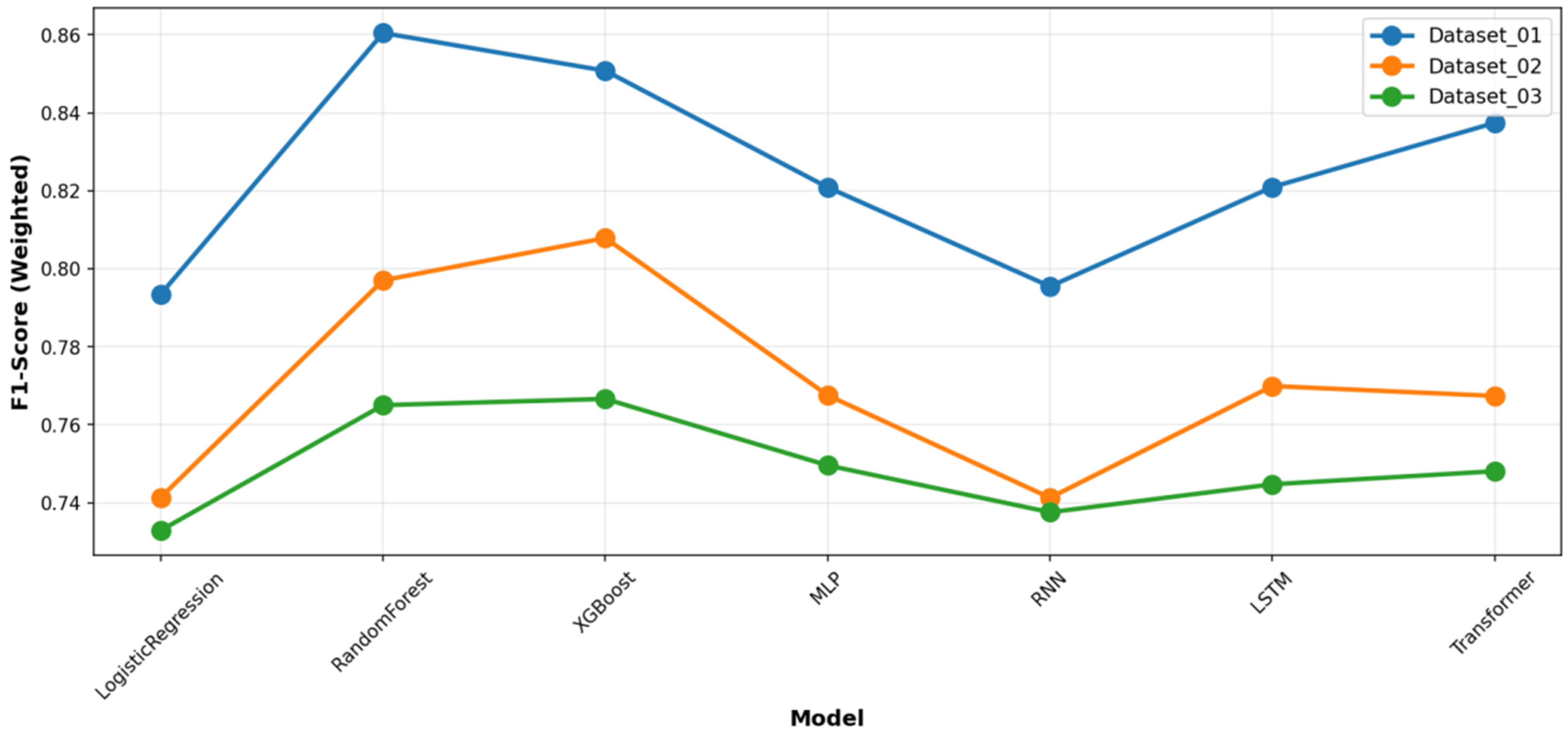 Table 4. Across all benchmarks, the tree-based ensemble methods, RF and XGBoost, consistently demonstrated superior and robust performance. RF achieved the highest mean accuracy (0.8265), while XGBoost attained the highest mean Weighted F1-score (0.8084), a critical metric given the class imbalance in our data. The consistent superiority of these two models across all three datasets is visually apparent in the overall performance comparison (