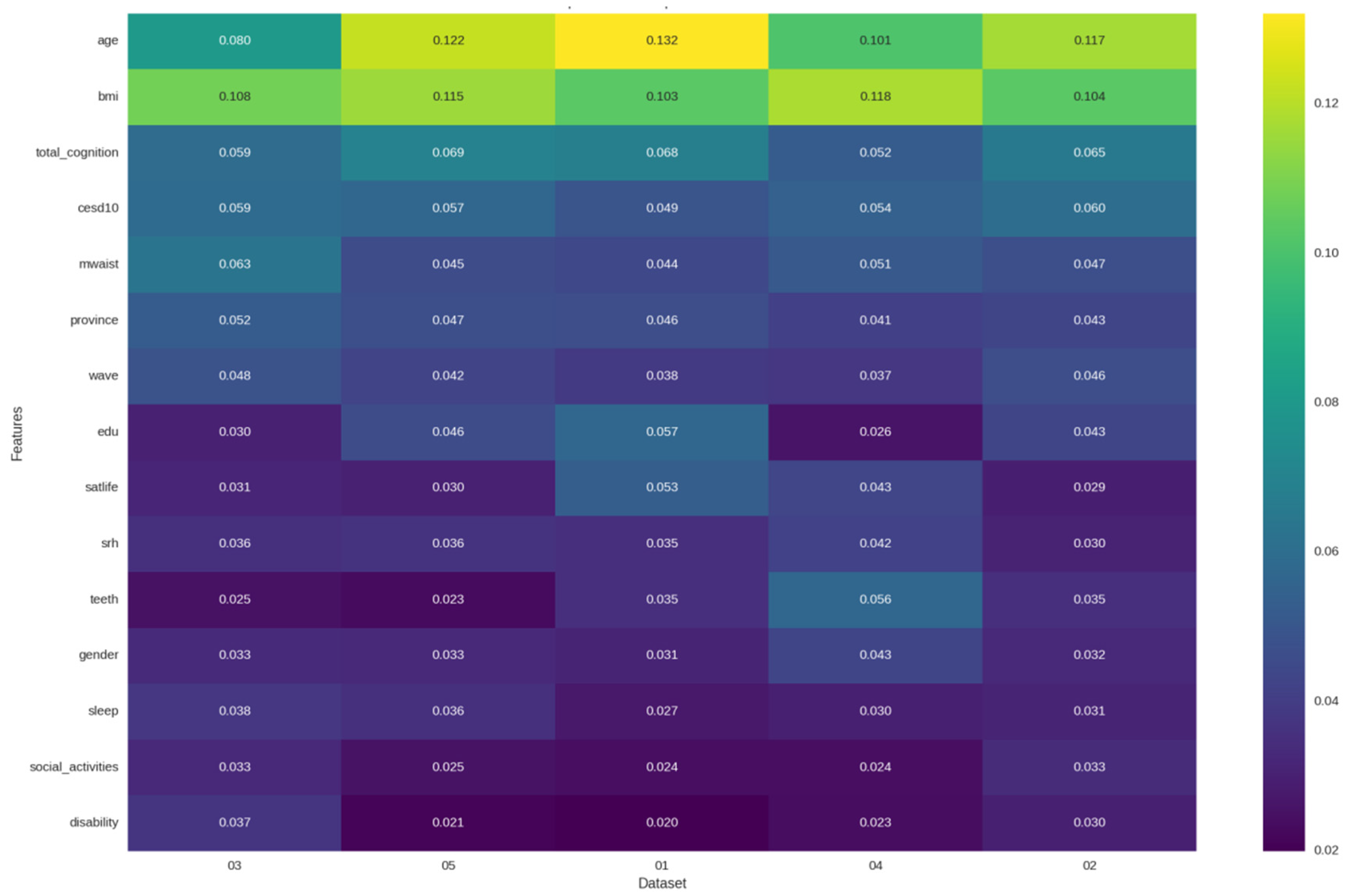 We addressed the issues of missing data and class imbalance with the following rigorous protocol. First, to handle missing values in the 28 input variables, we applied a comprehensive, adaptive multiple imputation strategy. The imputation was performed using the IterativeImputer from the scikit-learn library, which employs a chained equations approach. A RandomForestRegressor (with n_estimators = 20) was used as the underlying predictive model for continuous variables within the iterative imputer, which was run for max_iter = 10 iterations to achieve convergence. To enhance the biological plausibility of the imputations, we tailored the strategy for different variable categories based on their epidemiological characteristics: Health status variables (e.g., hypertension, diabetes, chronic disease) were imputed using a combination of individual historical data (forward/backward filling where available) followed by mode imputation; Lifestyle variables (e.g., smoking, alcohol consumption) were imputed using longitudinal patterns; Cognitive function variables (e.g., total cognition score) were imputed based on linear regression models incorporating age; Socioeconomic variables (e.g., income) were imputed using stratified means/modes based on geographical region; Categorical variables were imputed using the mode. We generated m = 5 complete datasets, each with a different random seed (42 + i for i = 1 to 5). The final analysis used the aggregated results from these five datasets. The imputation process was successful, with a 100% imputation rate, reducing the missingness from the original count to zero across all 28 processed variables.