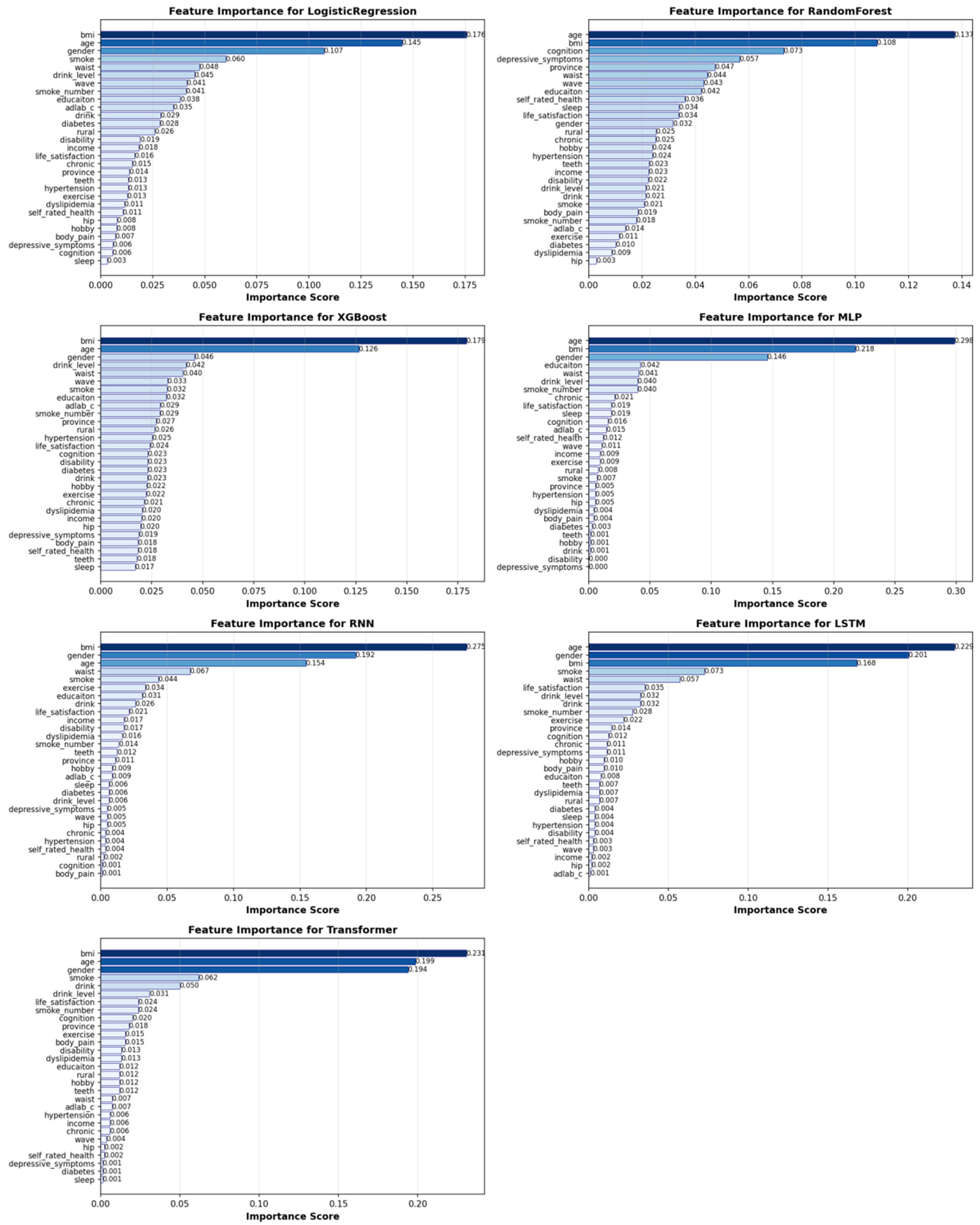 In conclusion, this feature importance analysis provides compelling evidence that depressive symptoms serve as a powerful and independent predictor of sarcopenia risk, operating within a complex network of physiological, cognitive, and behavioral factors. This finding crucially validates our core methodological innovation—using dynamic depression trajectories rather than single-point assessments—by confirming that mental health status contains unique and significant information for predicting future physical frailty. This multidimensional risk profile, uncovered by AI, not only predicts risk but also points to actionable targets for public health interventions, such as promoting cognitive activities and smoking cessation alongside mental health care. It is important to emphasize that the feature importance analysis presented here identifies predictive associations rather than establishes causality. The models highlight which variables, including depressive symptoms, are most informative for predicting sarcopenia risk within our dataset. The observed associations may be influenced by unmeasured confounding factors or complex bidirectional relationships.