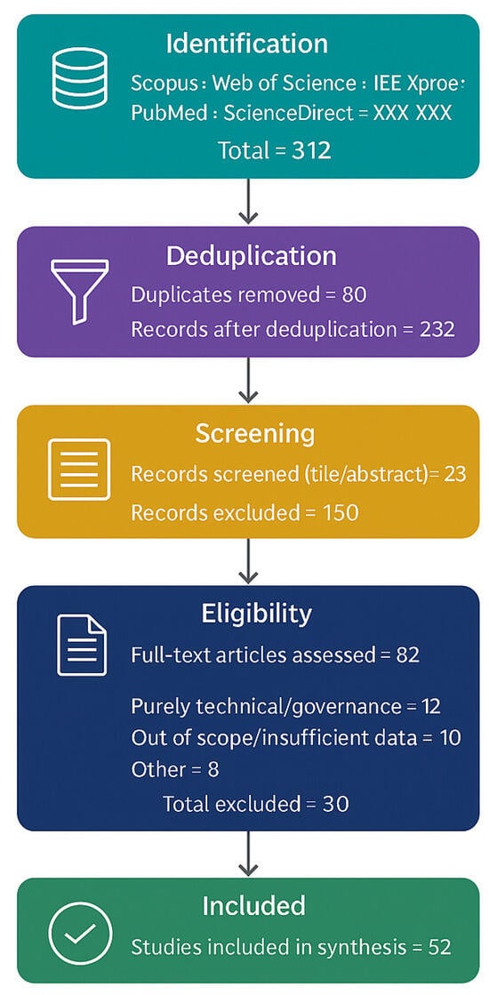 PRISMA 2020 flow chart illustrating the identification, screening, eligibility, and inclusion stages of the systematic review. Records were retrieved from Scopus (n = 120), Web of Science (n = 90), IEEE Xplore (n = 45), PubMed (n = 37), and ScienceDirect (n = 20), yielding a total of 312 records. After removing 80 duplicates, 232 records remained for title and abstract screening, of which 150 were excluded. Eighty-two full-text articles were assessed for eligibility; 12 were excluded as purely technical or governance papers, 10 as out of scope or lacking sufficient data, and 8 for other reasons. A total of 52 studies were included in the final synthesis.