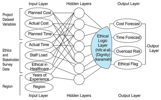 As shown in Figure 4, inputs comprise two streams. The first is healthcare data such as patient load, staffing, budgets, and equipment. The second is ethical signals encoded from maqāṣid. Processing combines task-specific ANN models with the Ethical Logic Layer. Outputs are managerial and clinical recommendations that satisfy technical performance and the ethical safeguards at the same time. The architecture makes explainability and audit part of the workflow rather than an afterthought [1,18,19].