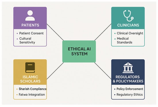The framework includes a formal co-design protocol. Clinicians validate safety thresholds and workflow fit. Patients and carers assess whether explanations are clear and respectful. Islamic scholars check the logic of rules against maqāṣid. Policymakers align outputs with national programmes. Workshops are iterative. Changes to rules and thresholds are versioned. This process reflects guidance that participation improves fit and legitimacy in ethical AI [12,16,20]. This step extends the reflexive methodology into practice, ensuring continuous stakeholder engagement in framework calibration.