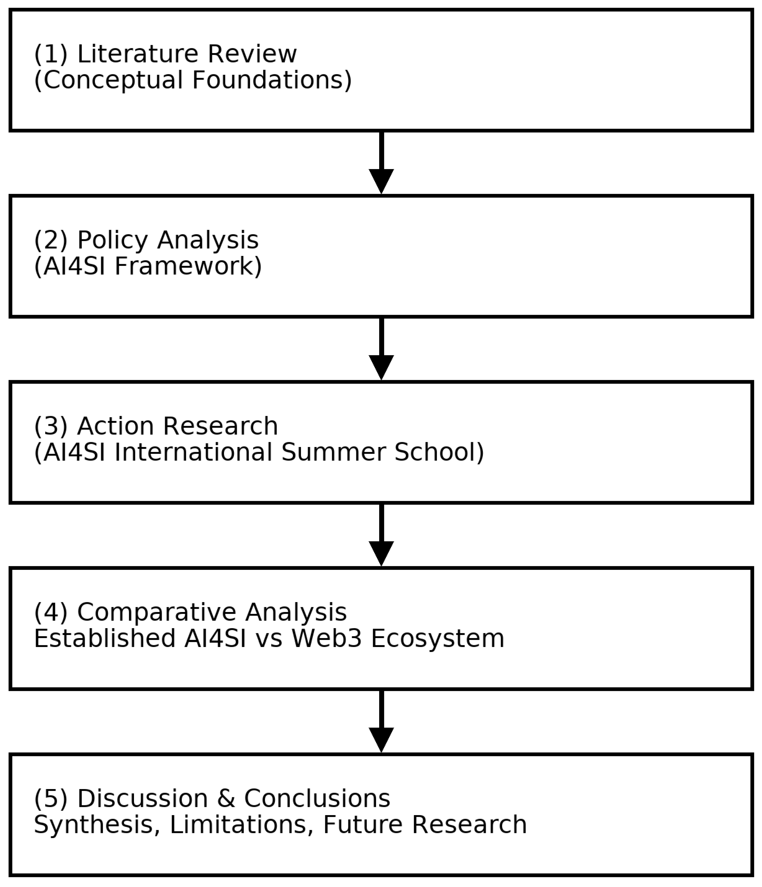 Figure 1) provides an overview of the paper’s methodological architecture. It clarifies how the study is structured and how its three core components—(i) the literature review, (ii) the policy analysis of the AI4SI framework, and (iii) the Action Research process conducted through the AI4SI International Summer School—connect to one another. The figure visualizes the sequential and iterative relationships between these components and demonstrates how they collectively inform the comparative assessment of the two innovation ecosystems analysed in the paper: the Established AI4SI Ecosystem and the Decentralized Web3 Emerging Ecosystem. This schematic is intended to guide the reader and strengthen the transparency of the methodological pathway followed throughout the study.