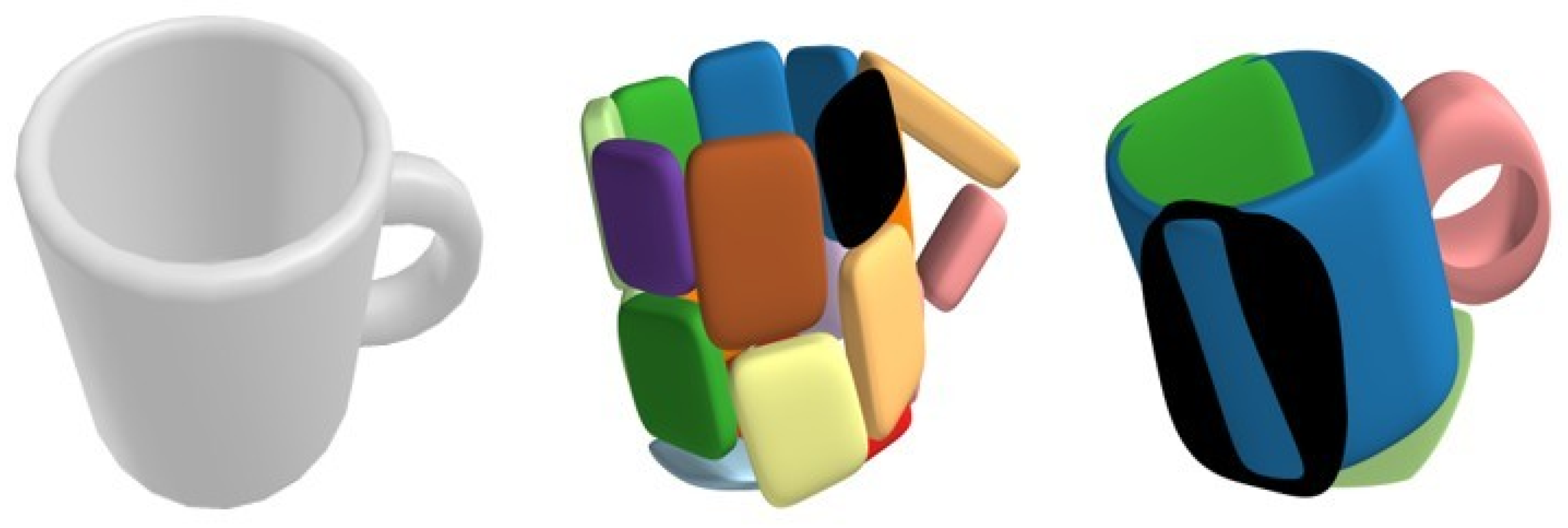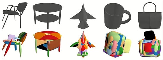 Mug and bag categories. These categories are characterized by curved geometries and fine structural details. The baseline method exhibits significant primitive overlap, resulting in misalignment and poor coverage of distinct components, such as the handle of a mug or the folds of a bag. The Eltaher method enhances structural coherence but still exhibits occasional primitive misplacement. In contrast, the proposed method achieves precise segmentation, accurately capturing the mug’s handle and following the natural contours of the bag with minimal redundancy.