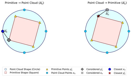 The final Primitive Accuracy score is computed as a weighted sum of the fit quality and corrected precision terms, jointly reflecting geometric alignment and topological validity. By integrating these two components, Primitive Accuracy provides a comprehensive measure of each primitive’s performance in both surface fitting and structural interpretation. The computation procedure for Primitive Accuracy is summarized in Algorithm 1.