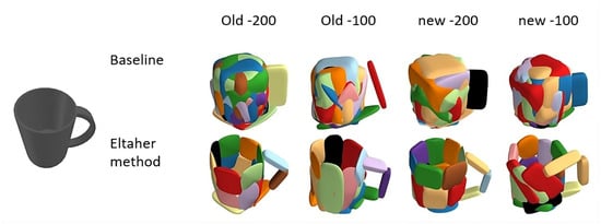 Eltaher method, the proposed model produces cleaner and more compact segmentations. Primitive boundaries align more consistently with the underlying object geometry, avoiding the oversized and redundant primitives observed in the baseline and improving upon the moderate overlap present in the