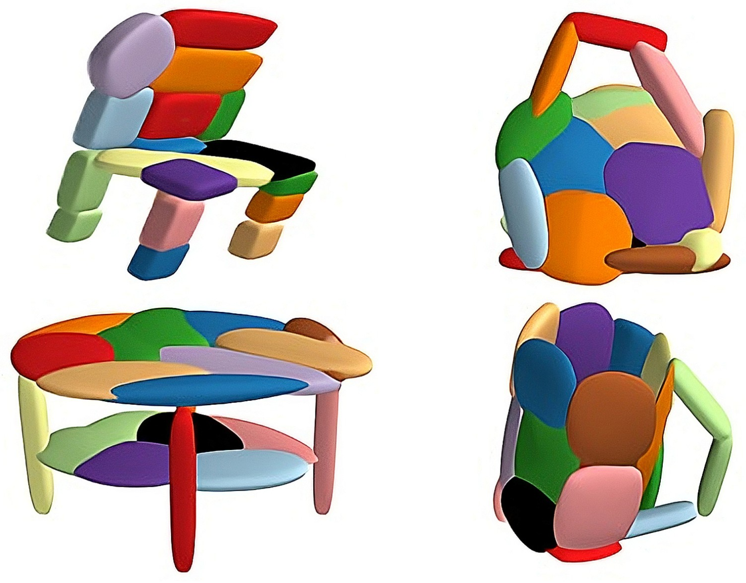 Table category. Tables generally feature flat surfaces and thin supports, which pose challenges for achieving accurate and clean segmentation. The baseline method shows the weakest performance, with an overlapping percentage of 0.97 and the lowest primitive accuracy (0.44). The Eltaher method lowers overlap to 0.33 and attains a structural accuracy of 0.96, although primitive accuracy remains low at 0.43. The proposed model further reduces overlap to 0.24 and substantially improves primitive accuracy to 0.69. Corrected Precision attains a value of 1.00, and despite a slight decrease in Structural Accuracy (from 0.96 to 0.90), the results indicate an overall improvement in decomposition quality.