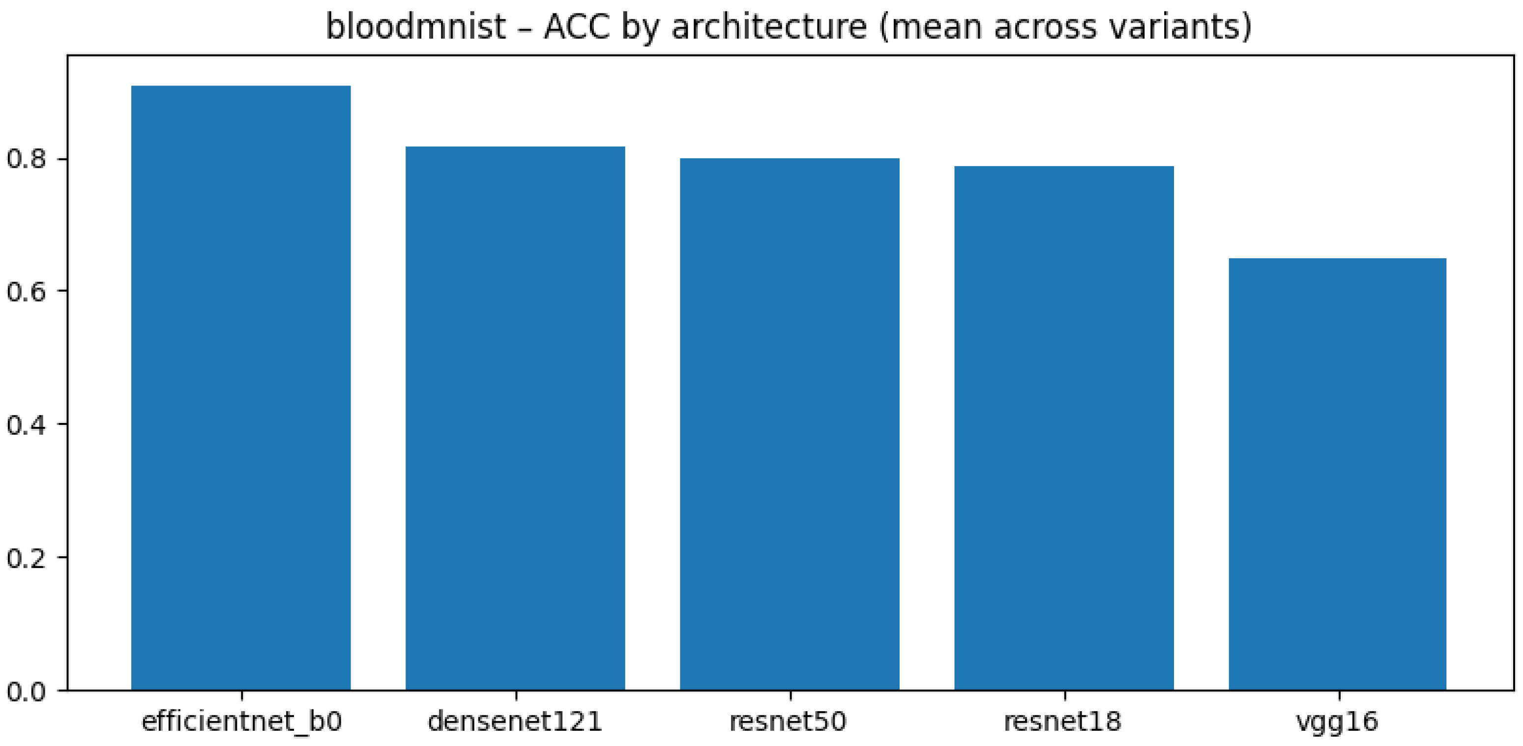 We began with a large pool of candidate datasets drawn from the MedMNIST collection, from which we selected ten representative datasets for detailed benchmarking. The selection process involved training each candidate dataset on five convolutional neural network architectures (ResNet50, ResNet18, VGG16, DenseNet121, and EfficientNet-B0) to obtain baseline performance metrics (balanced accuracy, accuracy, and macro AUC).