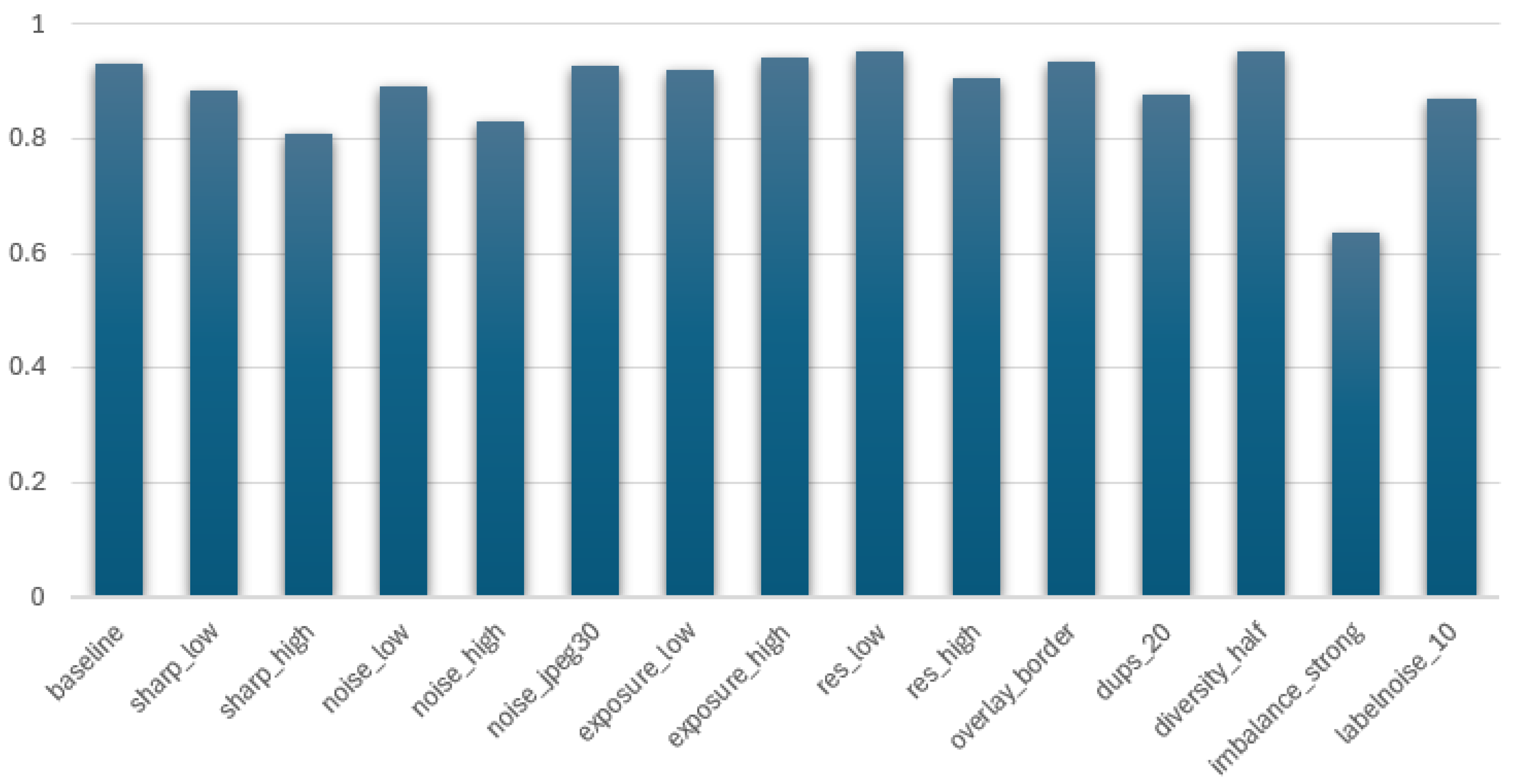 Table 4) shows a consistent hierarchy in how degradation types affect downstream performance. For each fitted weight, we report the mean value across bootstrap replicates, its standard deviation (std) quantifying variability of the estimate, and the 95% confidence interval (CI) obtained from the empirical bootstrap distribution. Imbalance, label-noise proxy, and separation produce the strongest and most reliable reductions in balanced accuracy, whereas mid-level degradations (noise, sharpness, duplicates) have moderate but variable effects. Lower-impact categories such as resolution or exposure exhibit small, often statistically insignificant weights. These results confirm that only a subset of degradation types systematically drives performance loss, supporting the weighting strategy used in DERI1000.