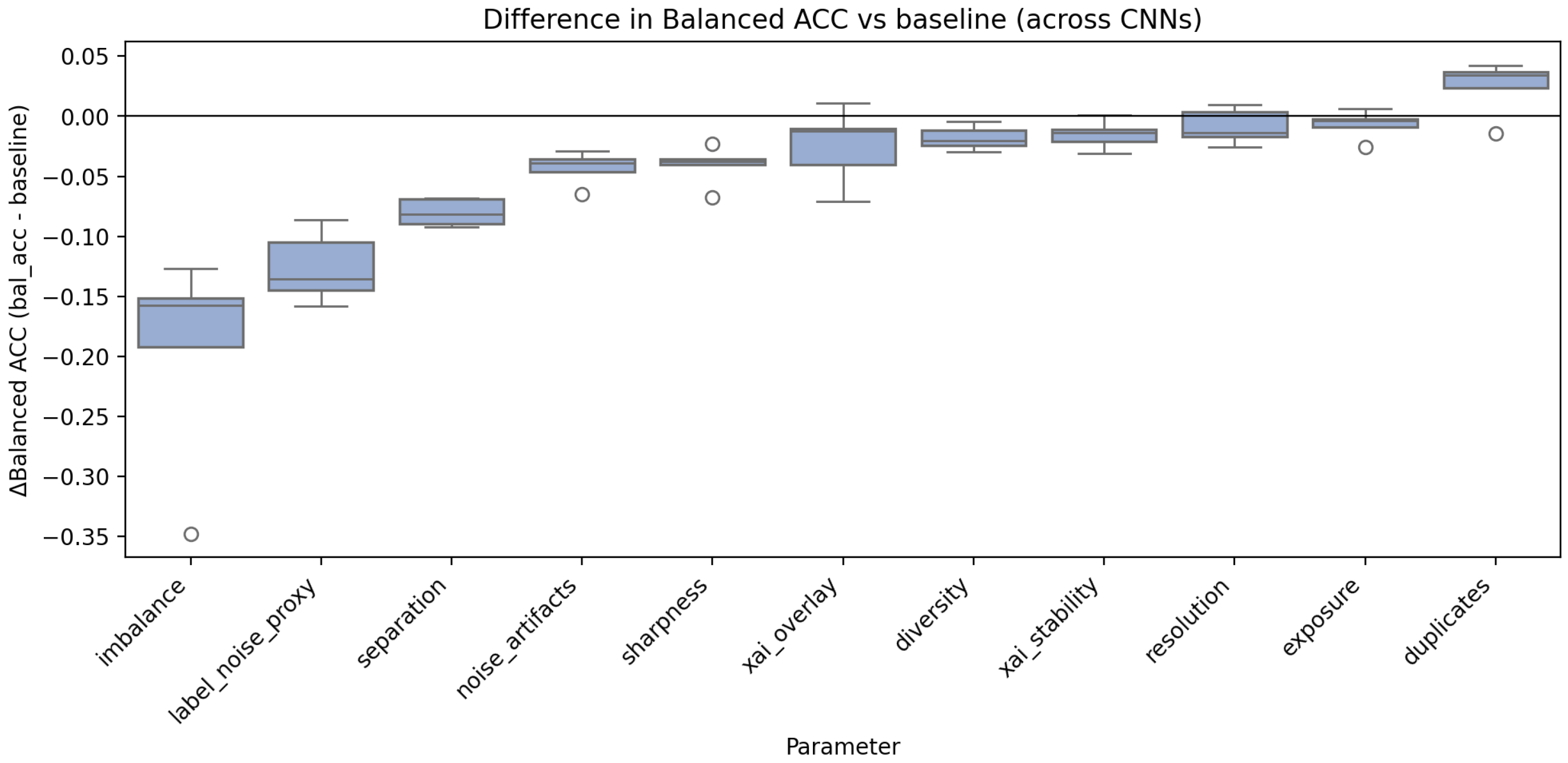 Balanced ACC) for each degradation type with respect to the baseline. The largest decreases occur under imbalance, separation, and label noise, while visual degradations such as exposure and resolution show minimal effects. This reinforces the conclusion that structural dataset properties dominate over low-level pixel distortions.