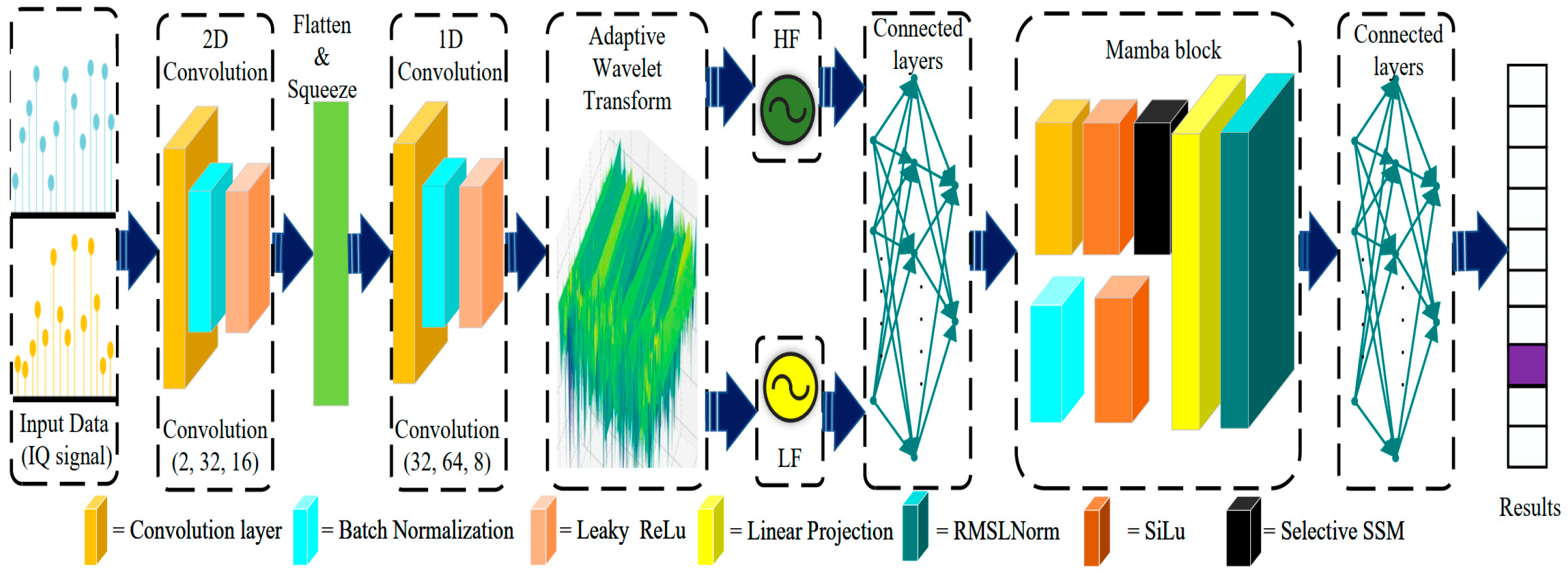 - The algorithm proposed in this paper is based on adaptive wavelet transform and the Mamba network (AWMN). It extracts periodic frequency and time series features from the received OFDM IQ signals by means of adaptive wavelet transform and verifies them through the publicly available RML2016.10a and RML2016.10b datasets, proving that the overall model is more effective in AMC.