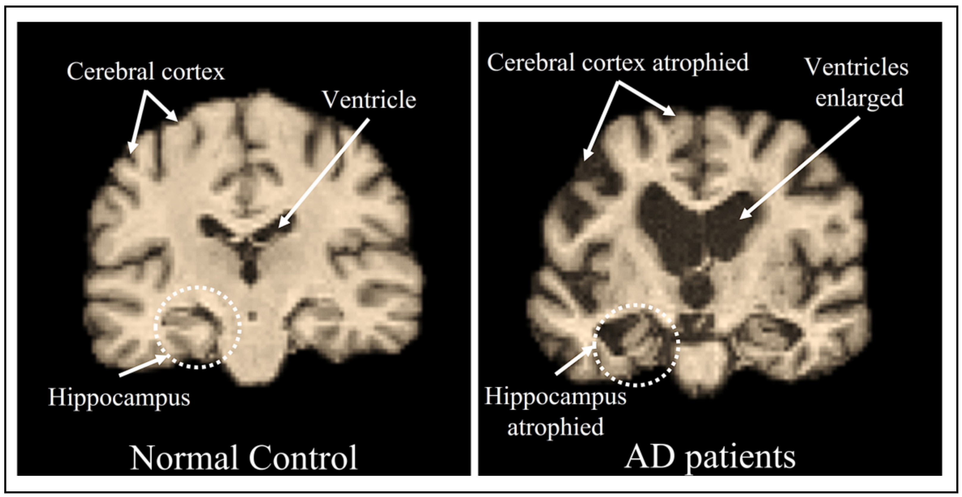 Figure 1 illustrates the distinction between healthy brain tissue and that affected by AD. In AD, brain tissue volume progressively decreases over time, with this reduction being accompanied by enlarged ventricular spaces and significant atrophy of the cerebral cortex and hippocampus.