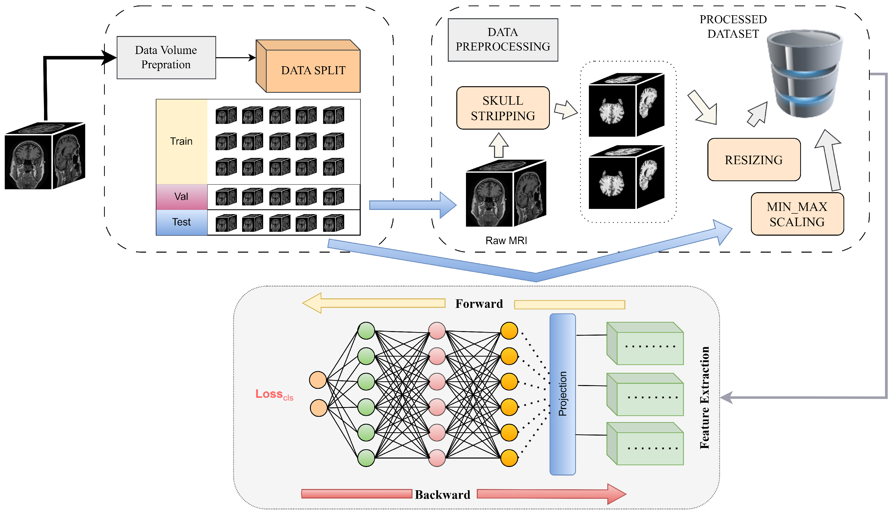 The collected dataset contained images with skull information, which is irrelevant for Alzheimer’s classification. Variations in depth, height, and width were observed across the images. To address these challenges, preprocessing techniques similar to those described in [