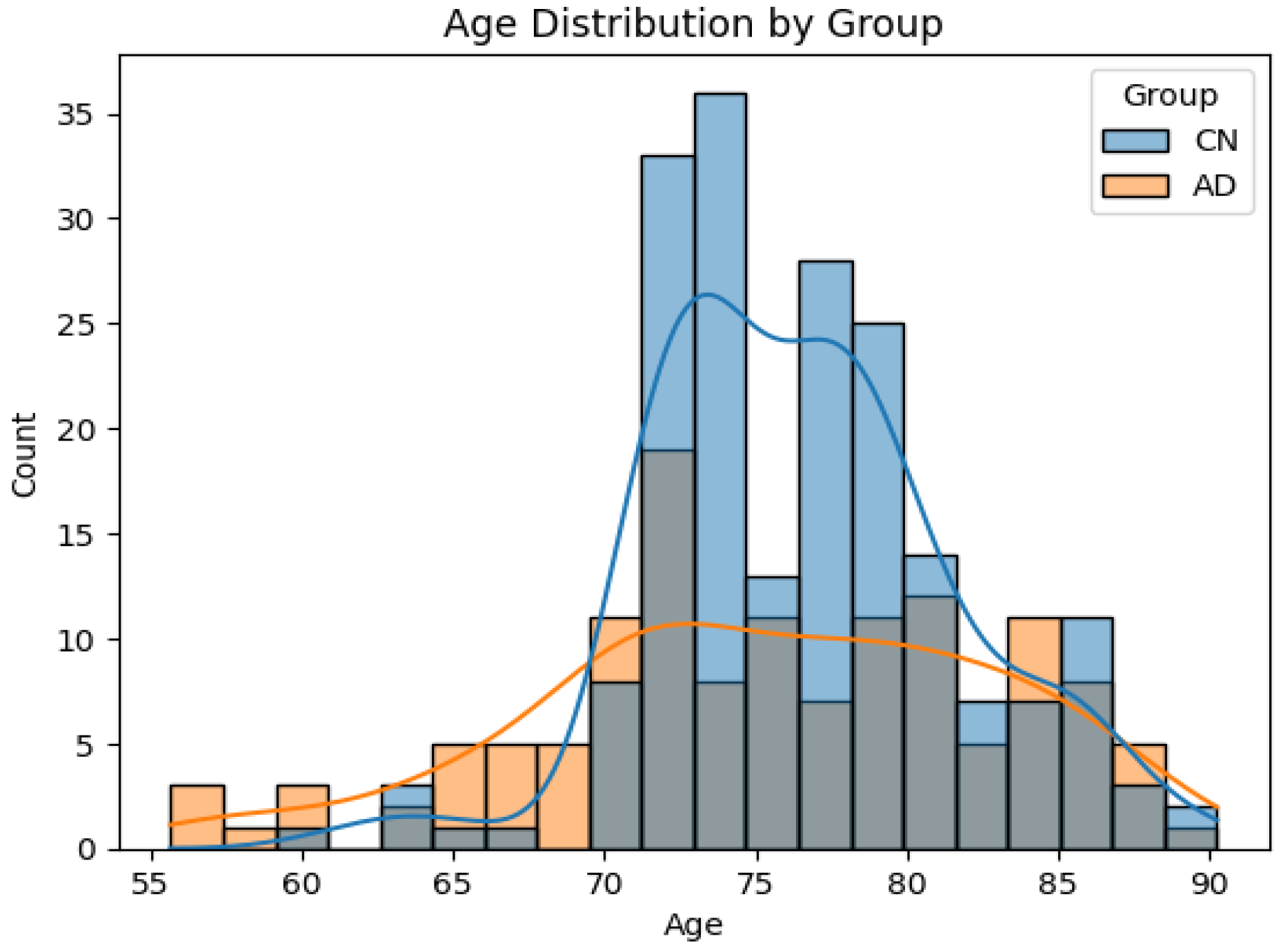 Figure 3 shows the age distribution with respect to the group. This study used publicly available, fully anonymised MRI data from ADNI. No new data were collected for this research.