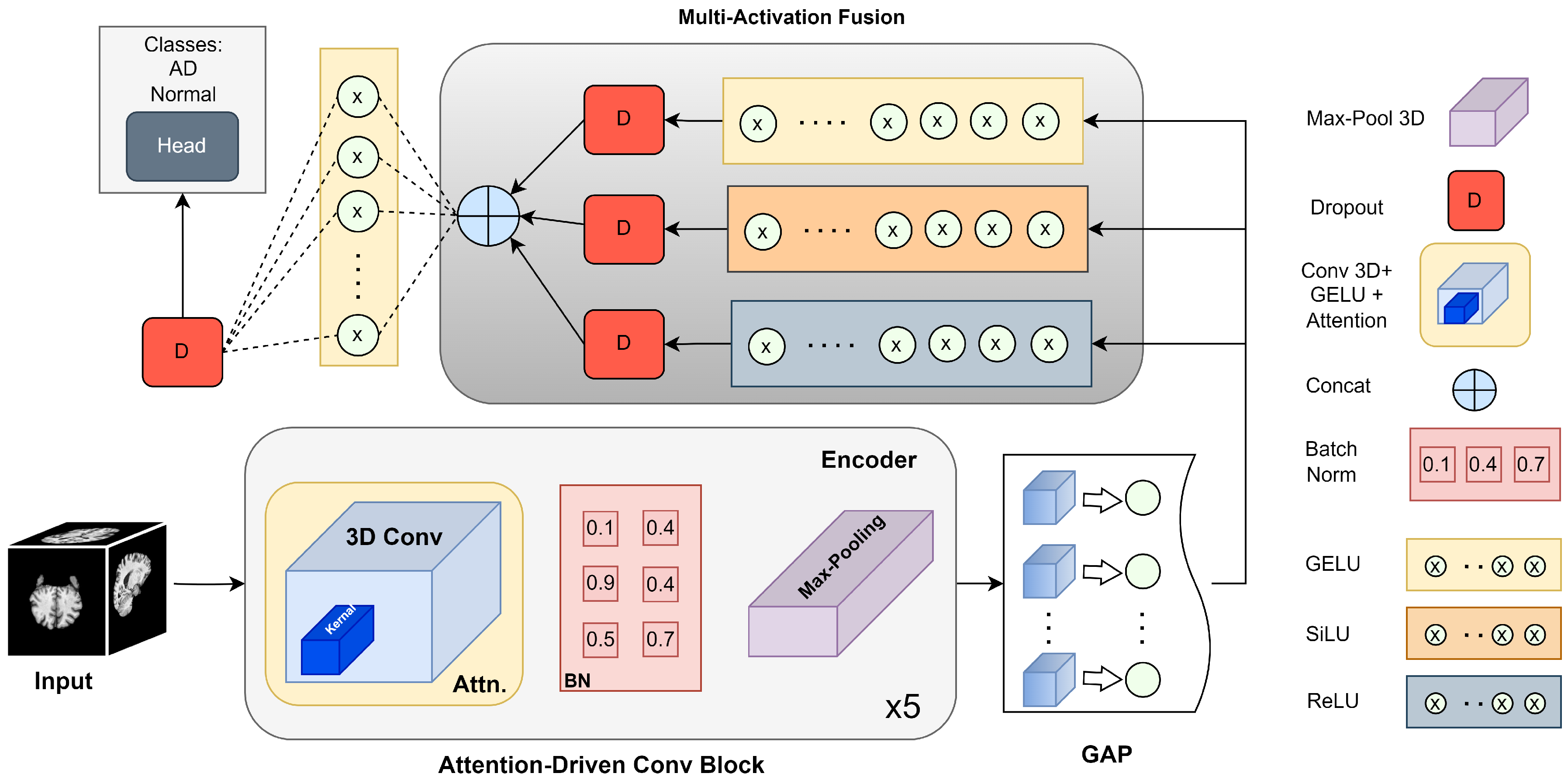 Figure 4, providing an overview of the attention-driven 3D CNN and its key components. This research proposes a novel CNN model that focuses on channel-wise attention mechanisms from scratch to perform accurate Alzheimer’s disease classification. Along with its superior performance, the model is highly optimised compared to other architectures. The proposed architecture consists of five attention-driven convolutional blocks (ADCB), where each ADCB block uses a Gaussian error linear unit (GELU) function for layer activation with a kernel size of (3, 3, 3) at each 3D-convolution layer. Furthermore, the architecture includes a multiactivation fusion block and a sigmoid activation function in the output layer. Moreover, L2 regularisation was applied to the kernels of each layer, with a lambda value of 0.02.