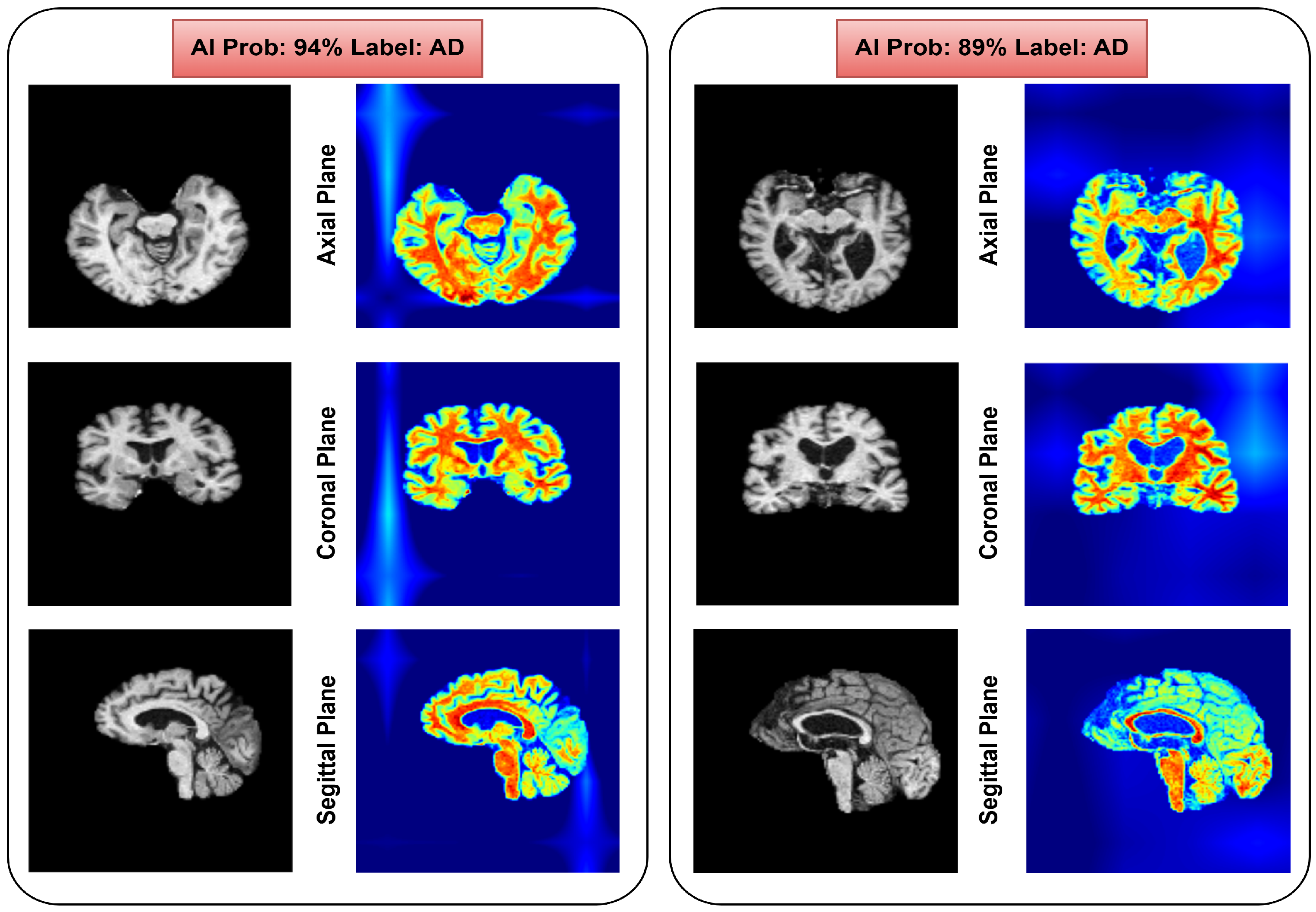Figure 11a displays heatmaps that show activated regions are widely distributed throughout the brain. This indicates that the proposed model can comprehensively analyse AD-related abnormalities across the brain. The capability to generate such extensive activation areas is one of the key strengths of transformer networks, attributed to their high receptive field.