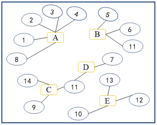 After obtaining the community partitioning of the network at time , according to the community evolution algorithm, to facilitate the community detection of the corresponding network in subsequent time slices, this paper records the characteristics of each community at , for instance in Table 2, in which the feature sets of the top five communities with the highest number of nodes at time are presented. Then, the data at time is classified based on whether its edges are related to the historical community feature set or not. If a data node has an edge connected to the historical community feature set, the data node is directly assigned to the historical community, and the historical community feature set is updated. Otherwise, a new bipartite network structure at time is constructed, and the CIA algorithm is applied for community detection in the new network at time .