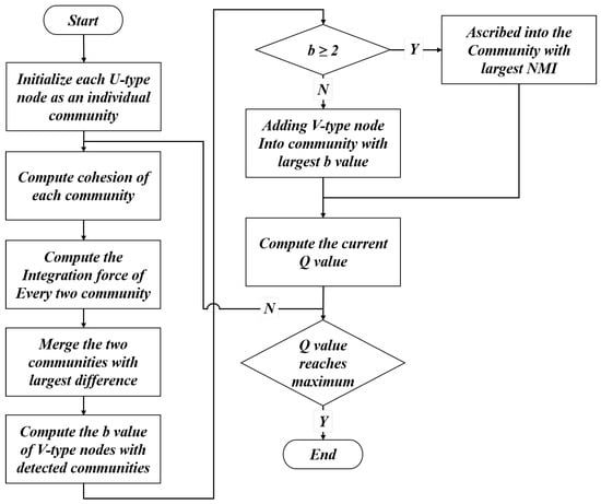 represents the degree of node ; denotes a community consisting solely of U-type nodes. denotes the number of nodes in community ; represents the count of common neighbors among all U-type nodes in community . The denominator part represents the sum of edge weights of all U-type nodes in community .
