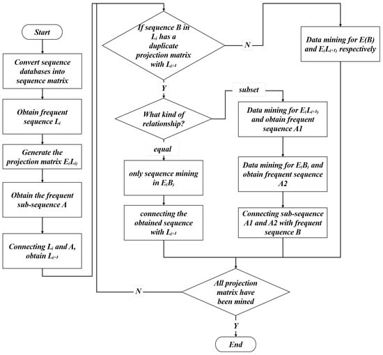 Generate the projection matrix separately and perform the conventional sequence-mining process. The algorithm terminates when all values in the projection matrix are 0 or the support of all items is less than the minimum support threshold.