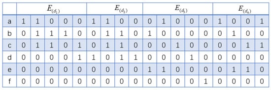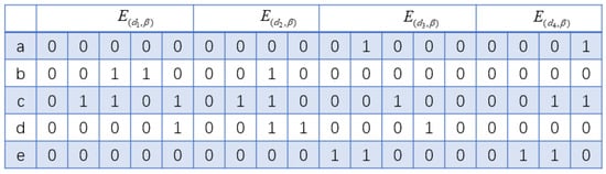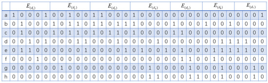 For example, , the positional values of the sequence prefixes in E are , and , respectively. Therefore, scanning all columns after the second column of the matrices corresponding to , , and in E yields the projection matrix, as shown in Figure 6. Taking as an example, the rules for generating the projection matrix are as follows: the sequence prefix has a position value of 2 in , and the last item of is b. Therefore, starting from the second column of , traversing vertically, item b is in the second row; thus, all position values before are 0, which means that the first column of is all zeros, namely , . The values after the second row are the same as those in . The values of the second column and beyond in are the same as the corresponding values in .