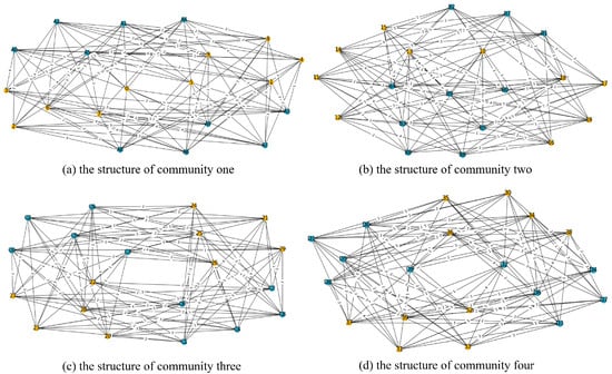 Step 5: Repeat steps 1–4 between and , and apply the CIA algorithm to the sub-bipartite networks and ; obtain the whole community results of , denoted as , and record the leadership of each community, namely .