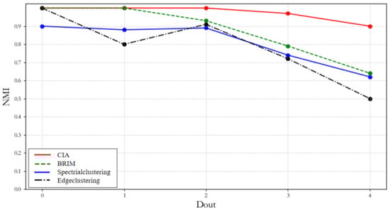 where M represents the total number of nodes in the network, and and represent the number of communities obtained by community partitioning algorithms C and D, respectively. denotes the total number of nodes in the ith community obtained by algorithm C, and similarly, denotes the total number of nodes in the jth community obtained by algorithm D. represents the number of common nodes between the ith community obtained by algorithm C and the jth community obtained by algorithm D [29]. From Formula (4), we can see that the closer the community partitioning results of the two algorithms are, the higher the value of mutual information. If the community partitioning results of the two algorithms are completely different, the Normalized Mutual Information (NMI) value is 0. The range of mutual information values lies between 0 and 1.