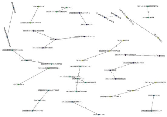 In the taxpayer–tax-officer network, the data nodes at time are classified according to the following rules: (1) if there is an edge between the taxpayer and the tax officer in the historical community, and either the taxpayer or the tax officer belongs to the feature set of the historical community, then all nodes belong to the historical community; (2) if one of the taxpayers or the tax officer belongs to the feature set of the historical community, then the other node is directly assigned to the historical community; (3) data nodes that do not possess the above two characteristics belong to the network at time . The algorithm iterates until when all data belong to a certain community, and the evolution of the entire network stops.
