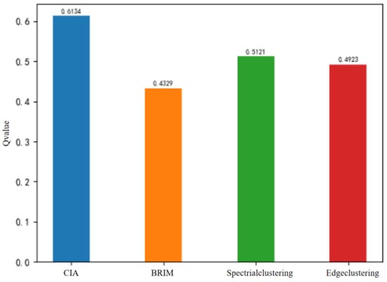From the modularity comparison chart shown in Figure 12, it can be seen that the Q value of the CIA algorithm is significantly higher than the other three algorithms. Comparatively, the Q value of the CIA algorithm has increased by 12.8%, 19.8%, and 8.4% over that of algorithms such as BRIM, spectral clustering, and the edge clustering coefficient, respectively. The community detection algorithm based on spectral clustering requires the number of communities to be known in advance; the parameter is set to 3 due to the three communities identified by the CIA algorithm.