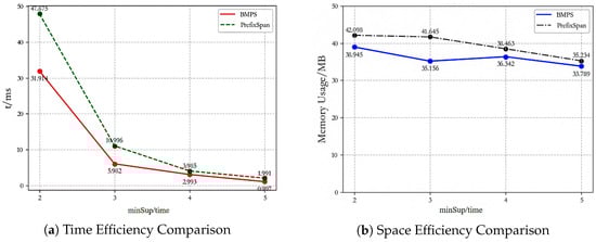 In order to assess the performance of the BMPS algorithm in terms of time and space efficiency, we present comparisons of the spatiotemporal efficiency between BMPS and PrefixSpan at different minimum support levels. From Figure 17a, it is evident that the BMPS algorithm outperforms PrefixSpan in terms of time efficiency at different support levels. Especially when min_sup is small, there inevitably exists a huge amount of duplicate projection matrices in the sequence database, leading to a significant difference in time efficiency between BMPS and PrefixSpan. As min_sup increases, the time efficiency gap between BMPS and PrefixSpan narrows, because there are relatively fewer sequences that satisfy the min_sup criterion.