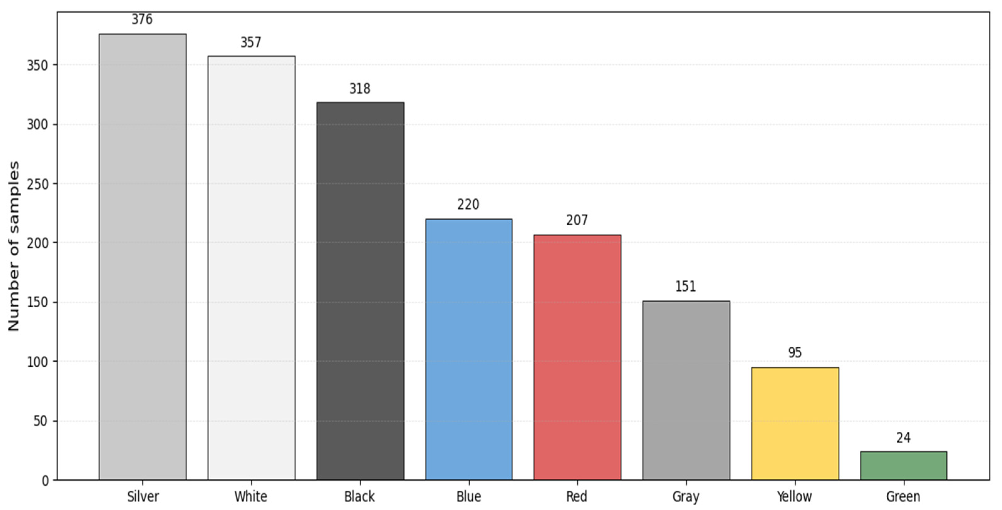 - Lima, G.E.; Laroca, R.; Santos, E.; Nascimento, E.; Menotti, D. Toward enhancing vehicle color recognition in adverse conditions: A dataset and benchmark. In Proceedings of the 37th SIBGRAPI Conference on Graphics, Patterns and Images (SIBGRAPI), Manaus, Brazil, 30 September–3 October 2024; IEEE: Piscataway, NJ, USA, 2024; pp. 1–6. [Google Scholar] [CrossRef]