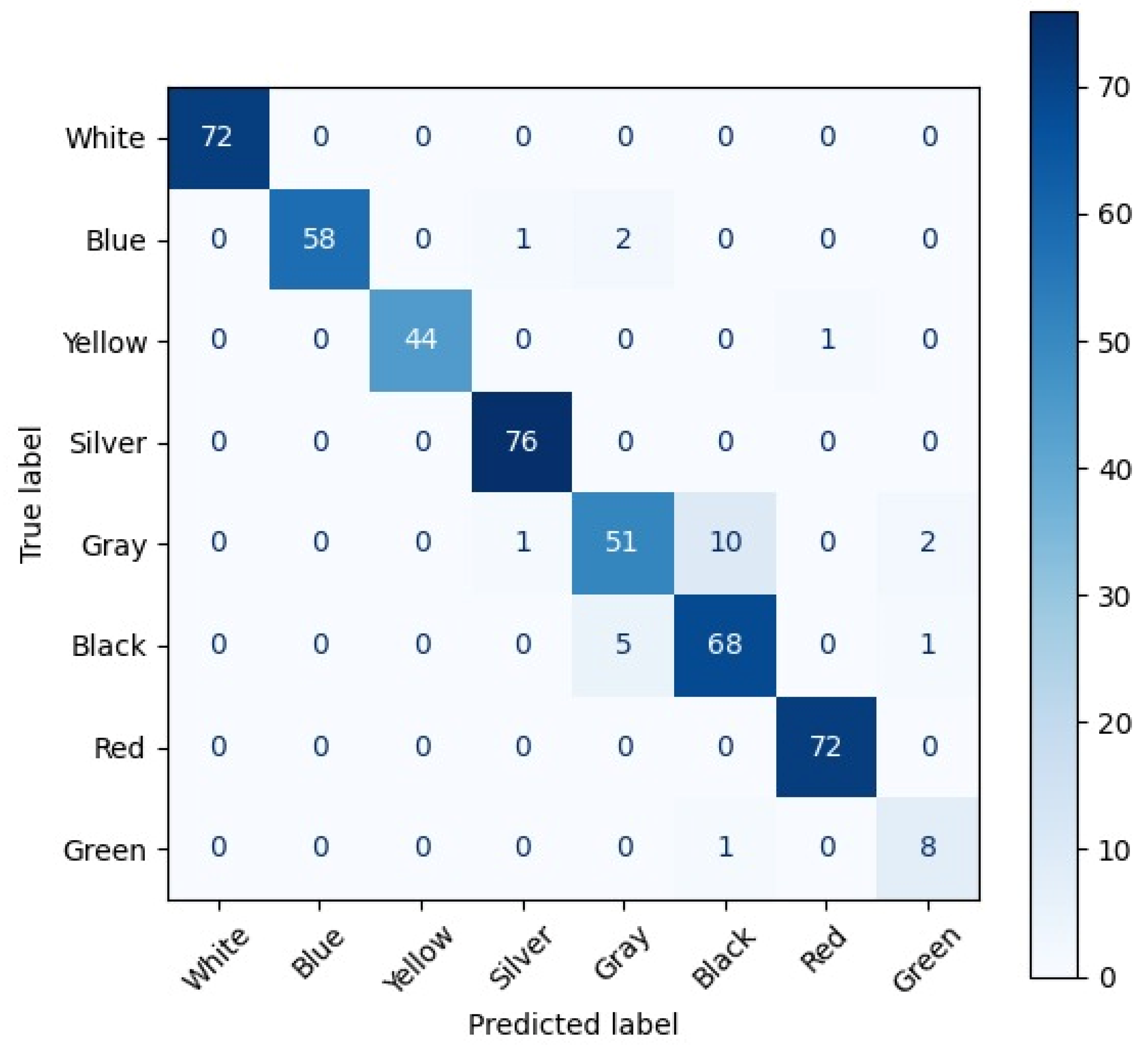 | Model | White | Blue | Yellow | Silver | Gray | Black | Red | Green | Avg. F1-Score |