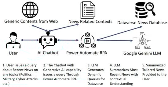 As seen in Figure 1, the presented AI-Chatbot obtains News reports from the Dataverse News Database. The Architectural details of this News aggregator have been detailed in earlier studies [,,]. However, this section will briefly cover some important aspects of this News aggregator. The Dataverse News Database (i.e., News aggregator) is systematically updated with daily news reports sourced from an extensive array of news outlets. This process leverages a network of news APIs (e.g., The Guardian News API, Microsoft Bing News API), Really Simple Syndication (RSS) feeds, and web scraping technologies, all coordinated through Microsoft Power Automate to refresh the database at variable intervals. Through Power Automate’s RSS connectors, prominent news portals, including CNN, BBC, CNBC, The Washington Post, The New York Times, LA Times, The Epoch Times, Fox News, The Daily Mail UK, The Guardian UK, CBS News, Voice of America, Politico, and Defence One (among others), are updated in real-time as news reports are published. These portals often provide multiple RSS feeds for different categories, such as Breaking News, World News, Political News, and Top Headlines. The Dataverse News Database prioritizes subscriptions to feeds that cover Breaking News, World News, Political News, Military News, and Technology News, with a limited inclusion of Sports, Travel, and Entertainment news, primarily from portals based in the US, UK, Australia, and India.