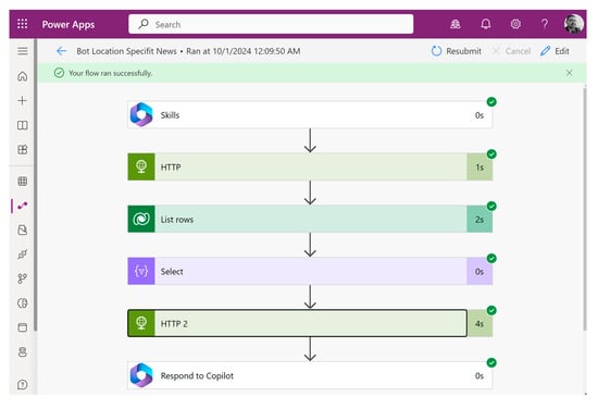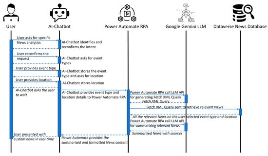 When a user interacts with the chatbot, the conversation triggers a dynamic process of news retrieval and summarization. The chatbot’s understanding of the user’s query is relayed to a Microsoft Power Automate flow. This RPA engine acts as an intelligent intermediary, orchestrating the formation of a precise FetchXML query. This query construction is not a static process; it leverages the power of a Google Gemini LLM to dynamically generate a query that accurately reflects the user’s request (as shown in step 3 of Figure 1).