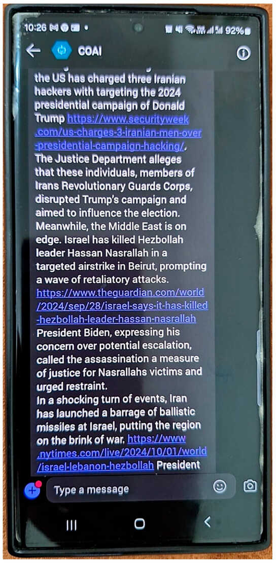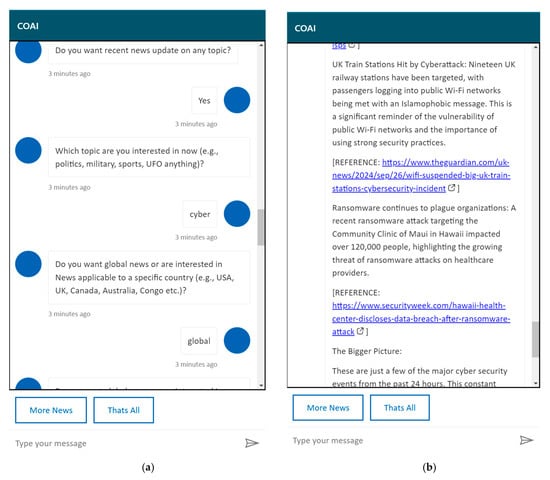Unlike all the 52 existing scholarly works (reviewed in this paper), our deployed News AI-Chatbot is published and publicly available at https://web.powerva.microsoft.com/environments/a00ca161-b640-eae8-9caa-8058a3d7ae19/bots/crd69_copilot/canvas?__version__=2&enableFileAttachment=false (accessed on 1 December 2024). This deployed chatbot provide an interface to the 989,432 News Articles used within the scope of this study. While using the deployed chatbot, the user needs to write “News”, then the system asks whether the user wants updates on any topics. Then, the user selects the topic (AI, Cyber, Politics, Election, Crisis, Military, War, International, Sports etc.). Next, the user selects the location, (it could be USA, UK, Global etc.). Finally, the result is presented with a detailed summary of relevant News with the actual News Sources.