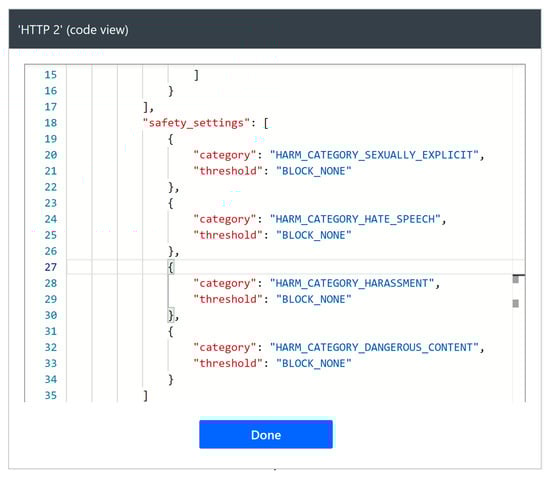 To address bias mitigation and ethical AI practices effectively, it is essential to consider both proactive measures and real-time moderation techniques in chatbot design [,,]. Recent work in AI ethics highlights the importance of transparency, privacy, and bias mitigation to foster responsible AI systems [,]. In implementing these measures, our chatbot employs multiple layers of filtering mechanisms and ethical guidelines. For instance, filtering tools are configured to identify sensitive or controversial topics, adapting responses to remain neutral and factual without promoting any specific viewpoint. This approach ensures that while the chatbot remains informative, it avoids escalating potentially contentious issues. The design incorporates regular updates to maintain a dataset that reflects diverse perspectives, addressing a common concern about inherent bias in language models []. As shown previously in Figure 6, Google Gemini API used within this study fully supported parameterized settings on effectively handing sensitive content like Sexually Explicit, Hate Speech, Harassment, or Dangerous Content. Sensitive content filtrations like these are currently supported by all major LLM providers like OpenAI’s ChatGPT, Microsoft’s Copilot etc.