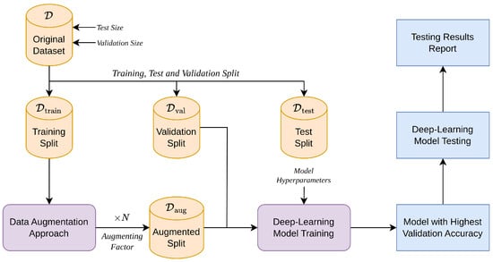 The training split, , serves as the input for the data augmentation process. The selected data augmentation approach and augmentation factor N are applied to expand the size of the training dataset by a factor of N (e.g., if the training split size is 100 images and the augmentation factor is 5, then the augmented split will contain 500 images). Following this approach, the augmented split is employed to train a specified deep learning model. Meanwhile, the validation split is used to calculate the validation accuracy and select the best model, i.e., the one that achieves the highest validation accuracy.