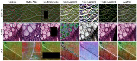 We start by assessing the quality, clarity and diversity of the compared augmentation approaches using the FID and IS values. Table 2 presents the FID and IS values for the six examined data augmentation approaches when applied to the 1200Tex, Kather and Brazilian Coffee Scenes (BCSs) datasets. From the tabulated scores, one can verify that for the 1200Tex dataset, the StyleGAN3 augmentation approach achieved the best (lowest) FID value, while AutoAugment delivered the best (highest) IS. For the Kather dataset, AugMix produced the best FID score, whereas TrivialAugment reached the best IS. Similarly, for the BCS dataset, AugMix attained the best FID, while TrivialAugment achieved the best IS. Nevertheless, as we shall see, an interesting finding is that the augmentation approaches that produce the best FID or IS values do not necessarily result in the highest model accuracies. This may occur because FID and IS are designed to measure the quality and diversity of generated images relative to the original images. However, they do not influence how the model utilizes this quality or diversity to identify more distinguishing features or enhance its generalization, thereby having no such direct connection to accuracy.